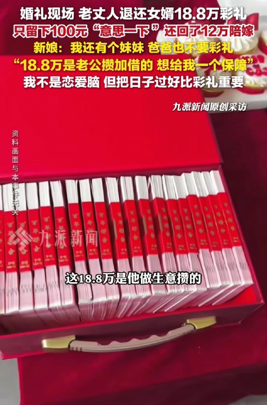 格局打开了!湖南益阳,一场婚礼上新娘父亲宣布退还男方 18.8万元 彩礼,仅留 100元 作为象征,称“不要被金钱蒙蔽婚姻”,对儿子和女婿一视同,新娘回应父亲举动既在意料中又意外,自己并非恋爱脑! 新娘廖女士今年30岁,在杭州上班,丈夫比她大一岁,是南县同乡,在家乡做水产生意,两人三年前经朋友介绍认识,恋爱两年多后决定结婚。 订婚的时候,廖女士和家人就明确说过不要彩礼,可丈夫特别有心意,还是主动筹备了18.8万元。 廖女士说,公婆年纪大了没什么收入,这笔钱一部分是丈夫辛苦攒的,还有一部分是他向亲戚朋友借来的。 婚礼当天的父母致辞环节,所有人都没想到,没读过多少书的父亲会突然宣布退彩礼的决定,只留100元当象征,还说出了“别被金钱蒙蔽婚姻”的话,就连新郎当时也特别震惊。 退回来的这18.8万元,丈夫第一时间用来还了借的钱,再扣除办婚礼酒席的开销,最后几乎没剩下什么。 廖女士也坦言,自己不是大家说的恋爱脑,其实也想把彩礼留着,但丈夫这几年生意不顺、收入不稳定,后续做生意思要本金,实在不忍心让他有压力,所以也支持退彩礼。 她还说,当地的习俗本是女方收下彩礼后,再交给新娘当小家庭的启动资金,可父亲从她到了恋爱年纪就说,绝不会要子女的彩礼,对她的妹妹也是同样的叮嘱,现在父亲还会在村里和同龄的父母分享这个想法。 有网友说:这位父亲太明事理了,这样的家风太难得了,婚姻本来就该靠真心,不是靠金钱衡量,现在很多地方彩礼攀比成风,这样的做法真的给所有人上了一课。 也有网友说:该给的彩礼还是得有,娶得太轻松了,男方就不会心疼人;还现身说法自己当初不仅不要彩礼还倒贴,结果女婿不珍惜,最后婚姻破裂,觉得自己亏大了。 在我看来这位父亲不是傻,而是看透了婚姻的本质!彩礼本来是男方的一份心意,是对女方的重视,可慢慢变了味,成了漫天要价的筹码,多少相爱的年轻人,最后都因为彩礼谈崩,错过了彼此。 廖女士也不是恋爱脑,她是清醒的,知道小家庭的日子要靠两个人过,与其拿着借来的彩礼,让婚后的日子被债务压着,不如互相体谅,轻装上阵。 而那些担心“不要彩礼会输”的,其实婚姻的输赢,从来不是看彩礼多少,而是看男方有没有担当、懂不懂珍惜。遇人不淑不是不要彩礼的错,是没看清人,不能以偏概全否定所有的真心。