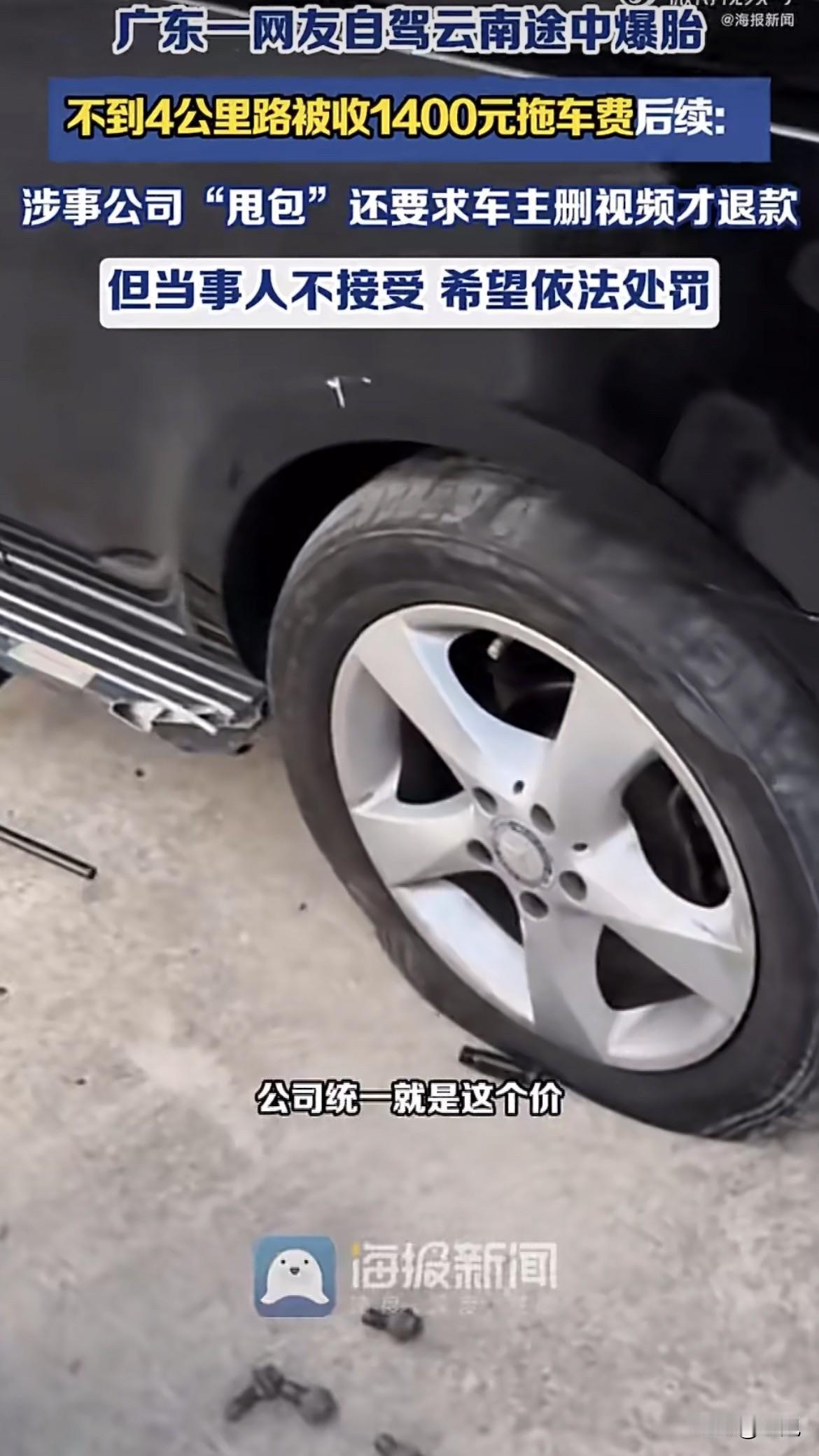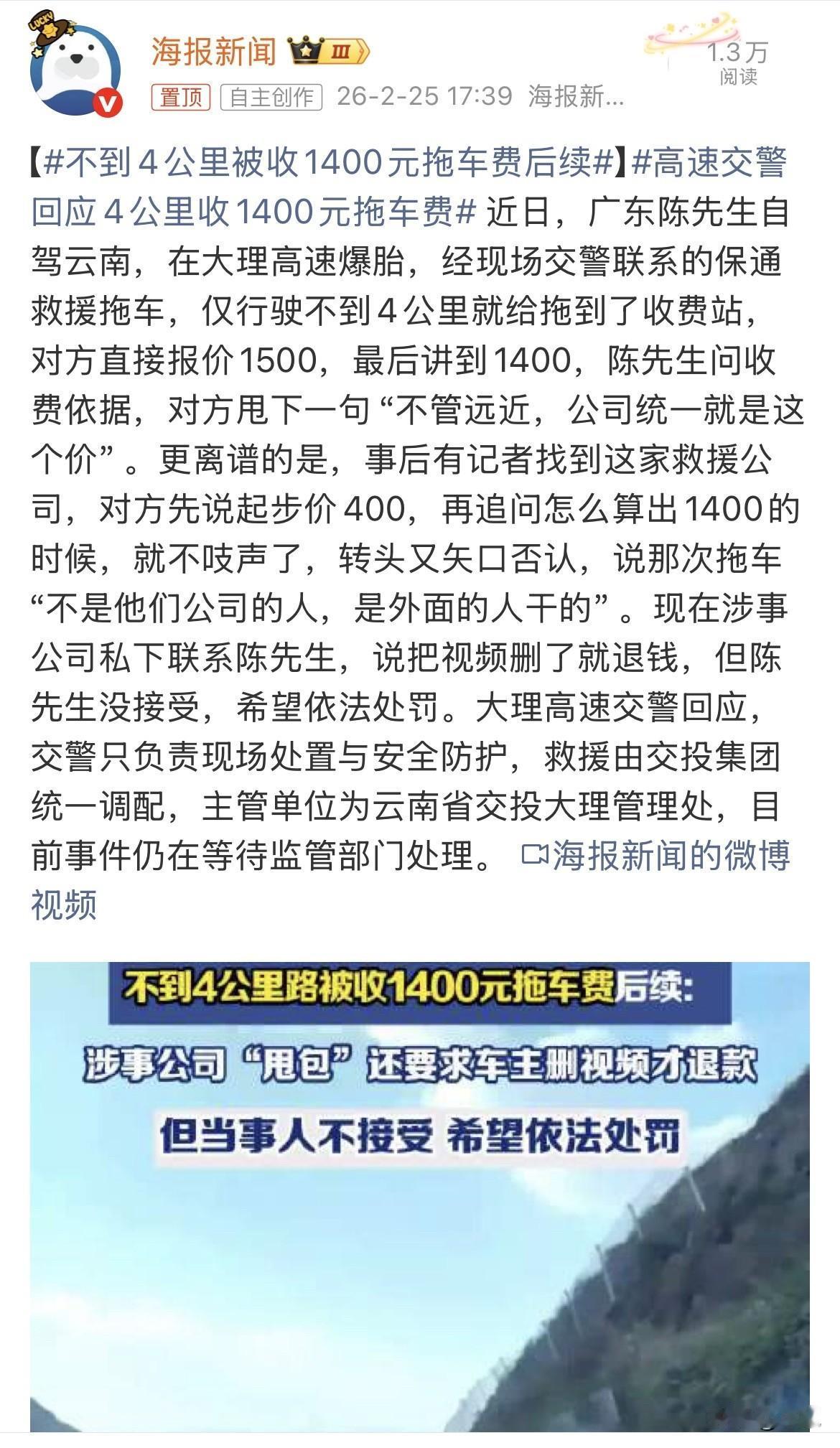 反转了?钱退了,但陈先生没要。 2月24号,事情发酵第三天。涉事的大理保通道路救援服务有限公司主动联系陈先生,态度跟之前完全两样。电话里那人说话挺客气,说事情搞大了对谁都不好,只要他把网上的视频删了,1400块钱马上退回来 。 陈先生听完,沉默了几秒。他说,钱我不退,视频我也不删 。 对方以为他嫌少,又说可以再商量。陈先生还是那句话:我不是为这1400块钱,我就是想要个说法,希望相关部门介入调查、依法处罚 。 2月21号下午五点多,他带着家人从广东潮汕自驾去云南,车开在大丽高速上,离挖色收费站不到4公里的时候,砰的一声,爆胎了。路对面正好有交警,帮他联系了拖车 。 拖车师傅穿着印着“保通救援”字样的衣服,把车拖到收费站后,张嘴就要1500。陈先生当时就愣住了,车上还有老人孩子,他问师傅这钱咋算的,人家眼皮都不抬:不管远近,公司统一价 。最后讲到1400,付了钱 。 陈先生自己就是做二手车生意的,对拖车行情门儿清。在他们老家,这种距离也就三四百块钱 。他把这事发到网上,视频火了,记者也找上门。 记者找到大理保通道路救援服务有限公司,问他们收费标准。工作人员先说“起步价是400元”,记者追问起步价之外怎么算出1400的,对方不吱声了。再问陈先生这单,对方直接翻脸不认人:“那不是我们公司拖的,是外面的人” 。 这边刚否认完,那边公司又私下联系陈先生,提了删视频退钱的事 。 陈先生后来接受采访时说,视频发出来后,有人质疑他“抹黑云南旅游”,他专门发视频解释过,说自己只是不建议自驾游,并没有抹黑的意思 。 记者又去问大理高速交警,交警说他们只负责现场处置和安全防护,救援是大理交投集团下属公司统一调配的,主管单位是云南省交投集团大理管理处 。记者联系这个大理管理处,电话一直没人接 。管理处应急指挥中心的人后来对媒体说,此事正在积极核实办理 。 截至2月25号,陈先生还在等。钱他没要,视频他没删,他说要等一个处理结果 。 大家伙儿说说,这1400块钱,要是换成你,是要还是不要?