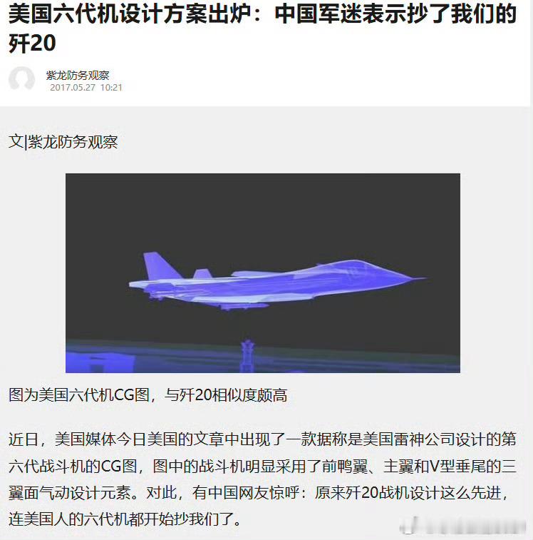 全球武器装备盘点美国f47测试机已秘密试飞近5年烽火问鼎计划 探讨F47采用鸭翼布局(假设)的合理性➡️图1~图3为美国雷神公司于2017年推出的下一代战机概念图,明确出现了鸭翼切尖三角翼近距耦合双垂尾小腹鳍类J20布局(但J20是远距耦合)➡️美国历史上不乏鸭翼无垂尾设计,例如图4的洛克希德舰载机方案、图5的波音X36技术验证机,在图6的成飞关于六代机综述里明确提到了小展弦比鸭翼飞翼布局与X36类似,如果对矢量有信心可以不要鸭翼,如果保守点就需要鸭翼提高机动性。➡️2023年波音鬼怪工厂PPT明确出现一款无垂尾的鸭翼大扁头无垂尾布局(图7、图8)、2026年负责动力的普惠公司再次拿出一款鸭翼大扁头无垂尾布局、但细节和雷神公司的概念图一样增加一对小腹鳍。⭐️图10成飞论文明确提到了增加吸波蒙皮处理的鸭翼在X波段RCS降低收益最大,边缘散射得到有效抑制。图11论文提到取消垂尾能带来减阻10%➕减重5%优势。图12的论文提到取消垂尾可以显著降低飞机RCS、减少浸润面积带来的摩擦阻力、提高气动效率、减少多翼面气动不利干扰、降低整机重量。图13展示了成飞早期的六代机布局同样有鸭翼,机头大扁头与F47趋同甚至比F47更激进,机头与鸭翼完全融为一体。➡️参考YF23有个圣诞树亲兄弟的方案采用固定全透波鸭翼可进一步降低鸭翼对长波的影响,至于固定鸭翼怎么提高机动性可以参考瑞典J37在鸭翼后面装活动副翼只影响后半球,RCS影响低于整片旋转的全动鸭翼,当然气动效率也不如全动鸭翼,这就是为了高隐形的设计取舍了。⭐️图14为美国网友为J20鸭翼平反昭雪。图15为目前中国两款六代机与五代机同角度对比,可以明显看到F47、南北六代机、成飞早期方案的共同特征机头必须足够扁用于增升、机头边条要大产生不对称机头涡实现偏航控制。➡️链接为波音爱好鸭翼的历史:网页链接 综上所述,F47用鸭翼六代机布局是可行的,至少可实现X~S波段全向隐形、最多在L/VHF/UHF波段只能迎头隐形,这点差距可以用CCA弥补,只是F47配套CCA也远不如93🥮的两款制空CCA,但无论如何也比装垂尾的GCAP更像六代机(图16)、图17欧洲网友承认GCAP更像J20例如机头垂尾而不像F47)。 图18为F47鸭翼布局想象图(参考图7波音鬼怪工厂方案)与J20同角度对比。