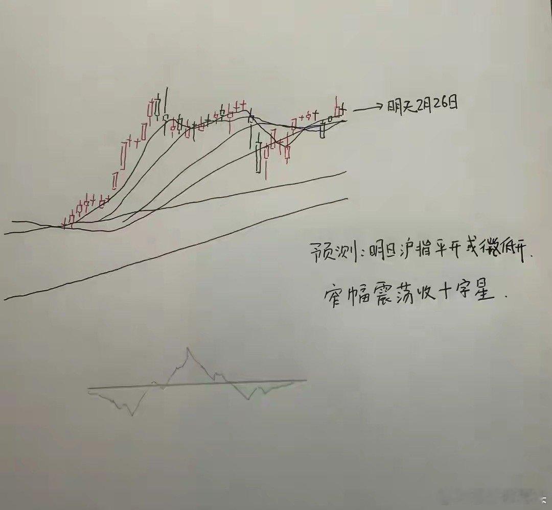 所以综合以上分析,对于明天市场的走势,莎哥的观点是,明天上证指数或者还会收出一颗窄幅震荡的十字星的走势。那么明天A股到底怎么走?大家请看图三关于明天走势的手绘预测图