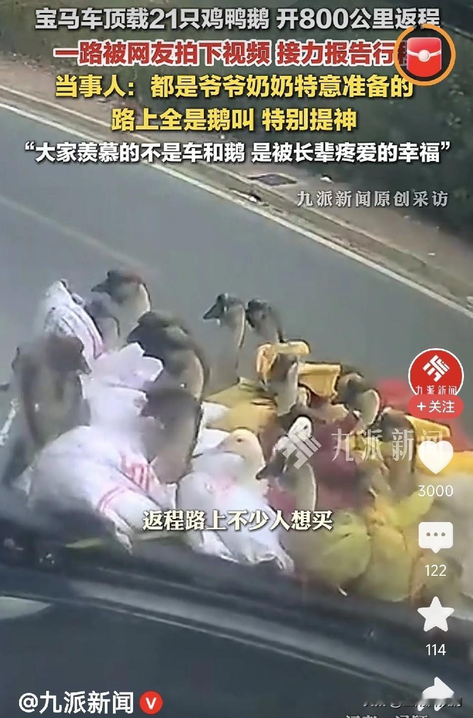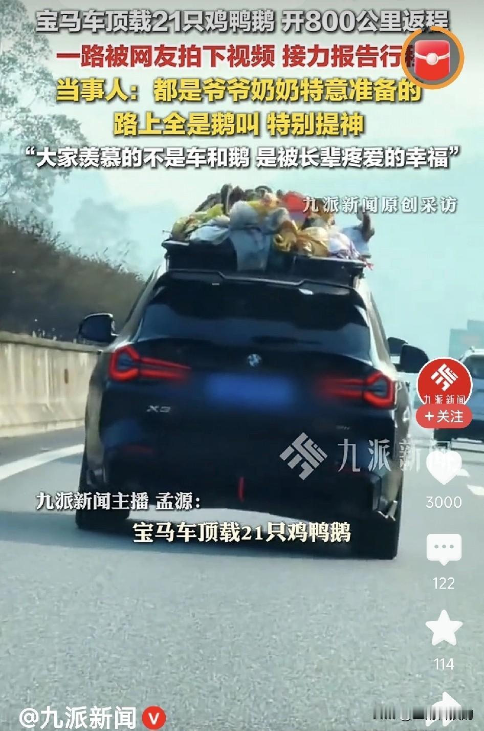 这几天网上最火的“显眼包”,必须是那辆顶着21只鸡鸭鹅跑800公里返程的宝马。你说这场景逗不逗?车主在前面开,车顶上大鹅、鸡鸭一路“嘎嘎嘎、喔喔喔”,提神效果比红牛都管用! 网友一路接力拍摄,场面很欢乐,但笑着笑着,大家突然就感动了。为啥?因为这车顶上装的不是鸡鸭鹅,是爷爷奶奶爸爸妈妈沉甸甸的爱! 当事人也说了,这都是长辈特意准备的。你想想,临出发前,爷爷奶奶肯定是一大早就忙活开了,逮鸡、抓鸭、捆鹅,哪怕后备箱塞满了,车顶也得利用起来,主打一个“爱无死角”。 这件事让大家羡慕的,是那份无论你多大、飞多远,家里总有人惦记着你有没有吃好的那份牵挂。大家羡慕的不是开的车和带的鸡鸭鹅,而是那种被长辈疼爱的幸福。 这一路800公里,车里载着归途,车顶载着乡愁,耳边响着的不是噪音,是独属于长辈的、热辣滚烫的唠叨和疼爱。这哪是返程啊,这是满载而归的幸福。这份“爱的托运”,才是春节返程路上最靓的风景线!(图片来源于网络,侵删)