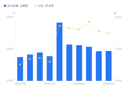 日期A股户数(户)流通A股户均持股数(股)户均持股市值(万元)2026-02-13195163937.8610.822026-02-10194603949.2010.982026-01-30205633737.3610.952026-01-20209683665.1710.302026-01-09211513633.4610.262025-12-19266582882.868.272025-11-20182094220.519.702025-11-10191294017.539.492025-10-31186354124.039.682025-10-20179844273.329.65