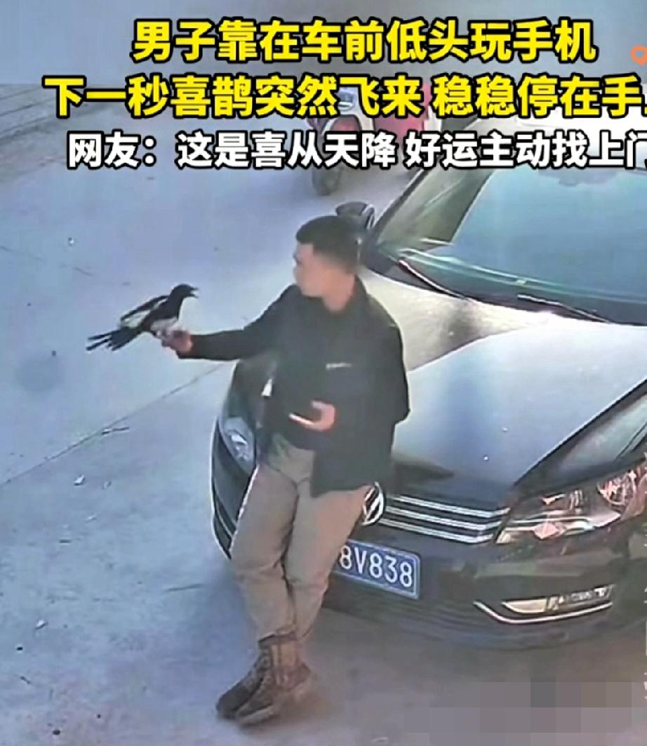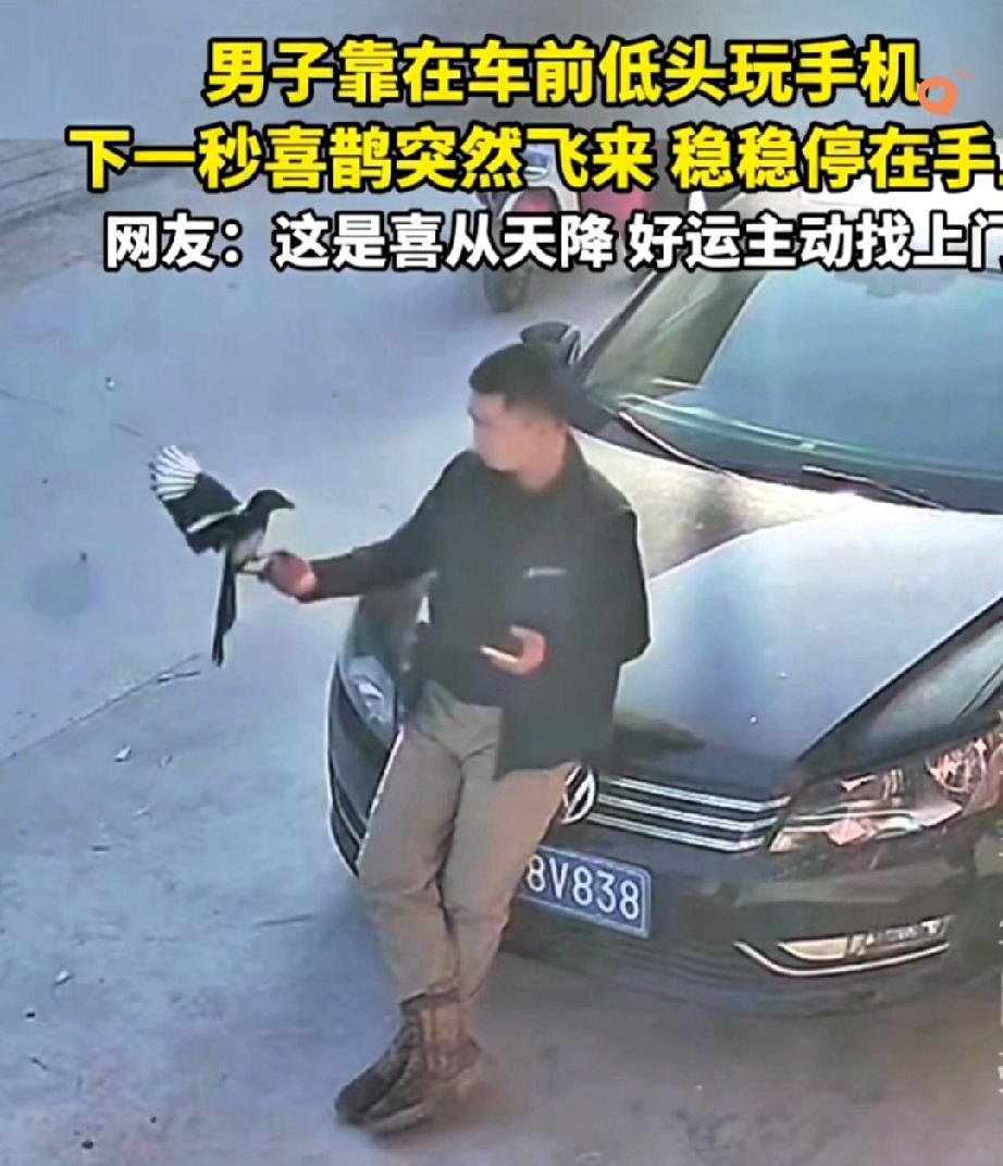 喜鹊接喜! 这一幕太治愈了! 男子正靠在车前低头玩手机,一只喜鹊突然主动飞来落在他手上,画面又暖又惊喜。 都说生灵最有灵性,从不靠近心术不正的人,喜鹊愿意主动亲近,足以说明这位男子心底善良、气场温和。 喜落掌心,福运自来。这不仅是难得的缘分,更是开年最好的吉兆。 生活里的小惊喜,往往都藏在温柔与善意里,你对世界温柔,世界也会用美好回应你。 看到这份喜鹊送的好运,新的一年必定顺风顺水,喜事连连,财源广进。 你遇到过喜鹊送喜的美好瞬间吗?快来接福接好运!