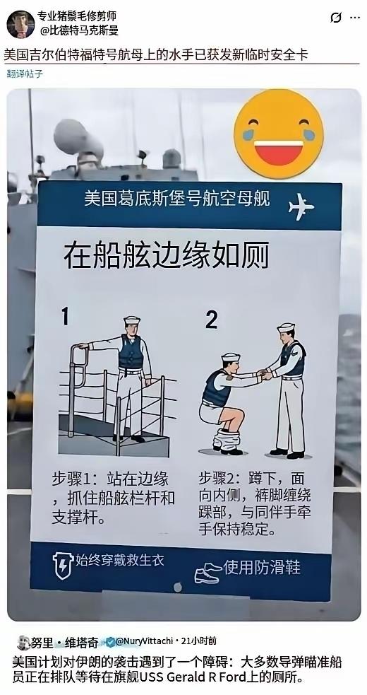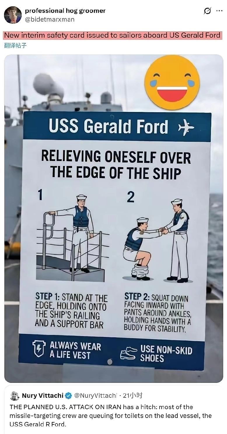 美国的福特号航母,近日被曝船上的650个厕所坏了80%以上,导致水手们上个厕所要排4、50分钟的长队,被迫中途停靠希腊,以便维修马桶……这可乐坏了网友们,有说美国最贵航母“喷粪”了,有问“还打伊朗不?”,还有人晒出来福特号航母的最新安全“船侧如厕”示意图,话说这样蹲船边上厕所,搞不好就上次厕所要一下损失两名士兵;或者如厕时来阵海风,岂不是要粪飞九天?粪涂甲板?然后飞机除了导弹之外还加了魔法攻击,威力大增? 特朗普正为要不要打伊朗犯愁呢,打吧,不是像委内瑞拉这类拉美国家那么好打,三两下也打不疼伊朗,不打吧,这脸又有点挂不住,飞机航母导弹都拉出来了。正好,最厉害的航母出事了,那不得按下暂停键啊,好比我们中国人开战前,风吹断了大旗,不是好兆头,必然出师不利啊!那就暂停一下,边修航母,边和波斯人磨磨嘴皮子,也许航母没修好,那边就谈完了,那就再好不过了。航母多贵啊,跑一趟油费都要花不少,多心疼…… 所以,我严重怀疑是特朗普指使人给破坏的,不然福特号航母这种核心重点武器,怎么至于出现大规模的厕所堵塞问题,而且早不出晚不出,就在要打伊朗前出问题了……你还不好质疑这种意料之外,又情理之中的毛病!“极限施压”嘛,那是特朗普最拿手的“交易的艺术”,除了在中国这碰过壁,向来是无往不利的。真打伊朗,那要花多少钱?搞不好会像在阿富汗那样,掉泥坑里了。所以吓唬吓唬就得了,出手之前要给对手留点消化“恐惧”的时间,这个节奏得把握好啊……所以福特号就不得不勉为其难的临时“堵塞”一下,人有三急,何况几千人的三急呢,那是个虽然不重要,但又不得不紧急处理的事…… 古时方士有水遁、土遁等五遁之法,美国人这次玩了把更高级的“屎遁”! 福特号因厕所堵塞趴窝是真的吗 美军福特号航母厕所近九成失