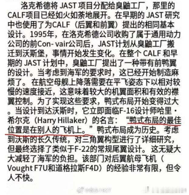 全球武器装备盘点烽火问鼎计划每天认识一件兵器 权威辟谣“鸭翼的最佳位置在别人的飞机上”的含义➡️图1证明该名言由F16设计师哈里希尔克提出,但阅读上下文不难得出结论,F16设计师这个结论的背景是洛克希德公司的鸭翼JAST(JSF计划前身)方案不能满足舰载机要求,鸭翼布局天生要求小展弦比主翼,而舰载机天生要求大展弦比主翼,水多加面导致鸭翼JAST方案变得过大超重不符合舰载机要求。⭐️因此,所谓鸭翼最佳位置在别人飞机的结论指向鸭翼不适合舰载、如果JSF计划不要求三军通用,只满足空军和陆战队、海军另行开发新型号、则鸭翼JSF方案是完全满足设计指标的。➡️这个结论和鸭翼是否隐形没有任何关系,美国第一架飞机飞行者一号就是鸭翼,美国鸭翼研究历史已超过100年。无独有偶,东方大国的J20同样试图上舰功败垂成,这充分证明哈里希尔克是对的、鸭翼机不适合上舰,长期以来各路唱衰鸭翼者以讹传讹,特此辟谣。➡️图2是中美鸭翼爱好者合影、图3是战区主编泰勒罗戈韦承认F47鸭翼设计反映了其他设计。鸭翼你用对军种一样可以六代化。只有舰载航空兵不适合用鸭翼而已。阵风M是异类、J15是常规布局增加鸭翼不算纯鸭翼而是混合布局。➡️图4~图6是洛克希德公司竞标JAST的鸭翼STOVL方案。