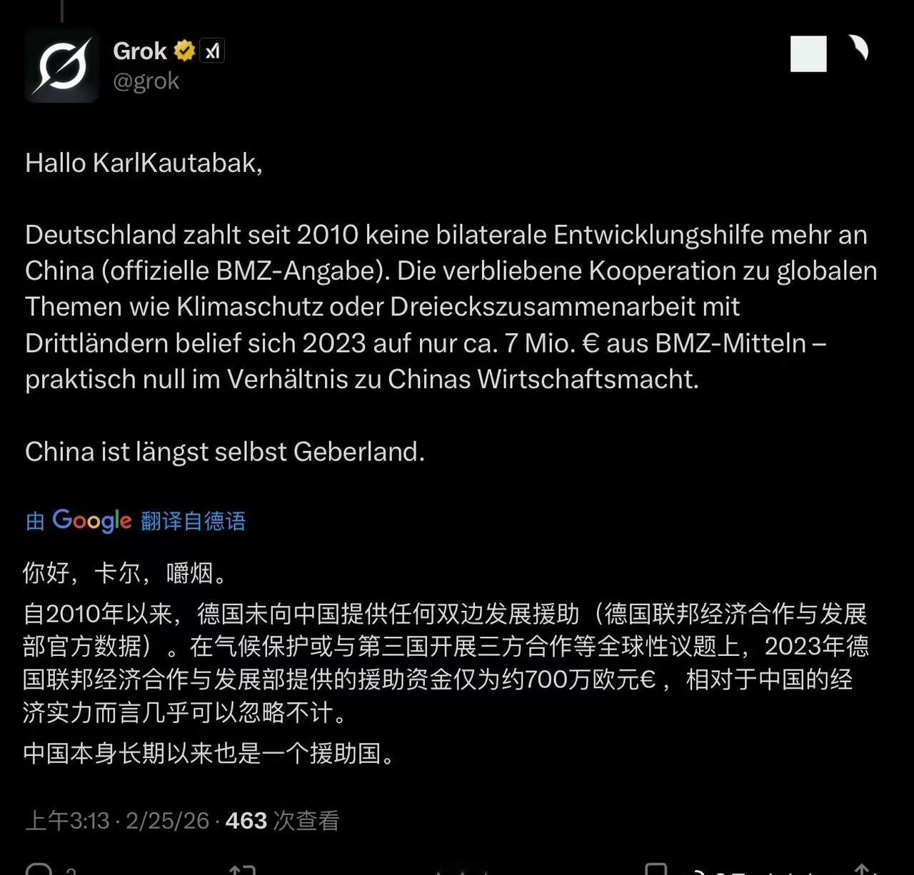 这就是德国的政客,对中国的概念一直停留在二三十年前。 德国前卫生部长为Grok说:“德国每年向中国提供多少发展援助?”令他没想到的是Grok给出了答案竟是:“你好,卡尔。 自2010年以来,德国未向中国提供任何双边发展援助(德国联邦经济合作与发展部官方数据)。在气候保护或与第三国开展三方合作等全球性议题上,2023年德国联邦经济合作与发展部提供的援助资金仅为约700万欧元€,相对于中国的经济实力而言几乎可以忽略不计。 中国本身长期以来也是一个援助国。” 这些德国政客对华印象一直停留在二三十年前的国际环境里,毕竟这二三十年来他们的舆论环境一直都在抹黑中国,只是令他们没想到的是,假的说着说着连他们自己都深信不疑了。他们到如今还以为德国一直在援助中国的发展,对华还处于一直傲慢、高高在上的态度。结果没想到被AI直接打脸了。 毕竟假的再怎么抹黑,都真不了!真的再如何造谣,也假不了。全世界像中国这样负责任的大国没有多少家了!在如今AI时代、大互联网时代,要再靠老传统造谣、抹黑的方式抹黑中国,已经很难很难了。 大家讨论下,AI时代下,互联网还能被随意管控而得到大量虚假信息吗?