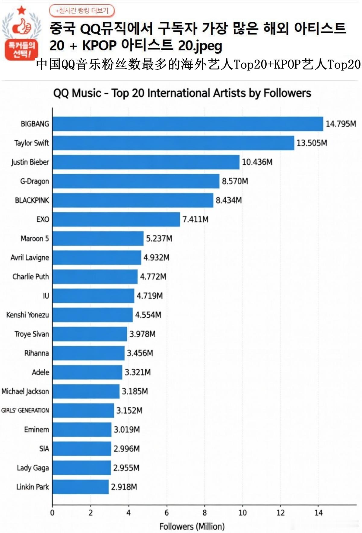 🔥韩网热帖评论翻译🔥中国QQ音乐粉丝数最多的海外艺人Top20+KPOP艺人