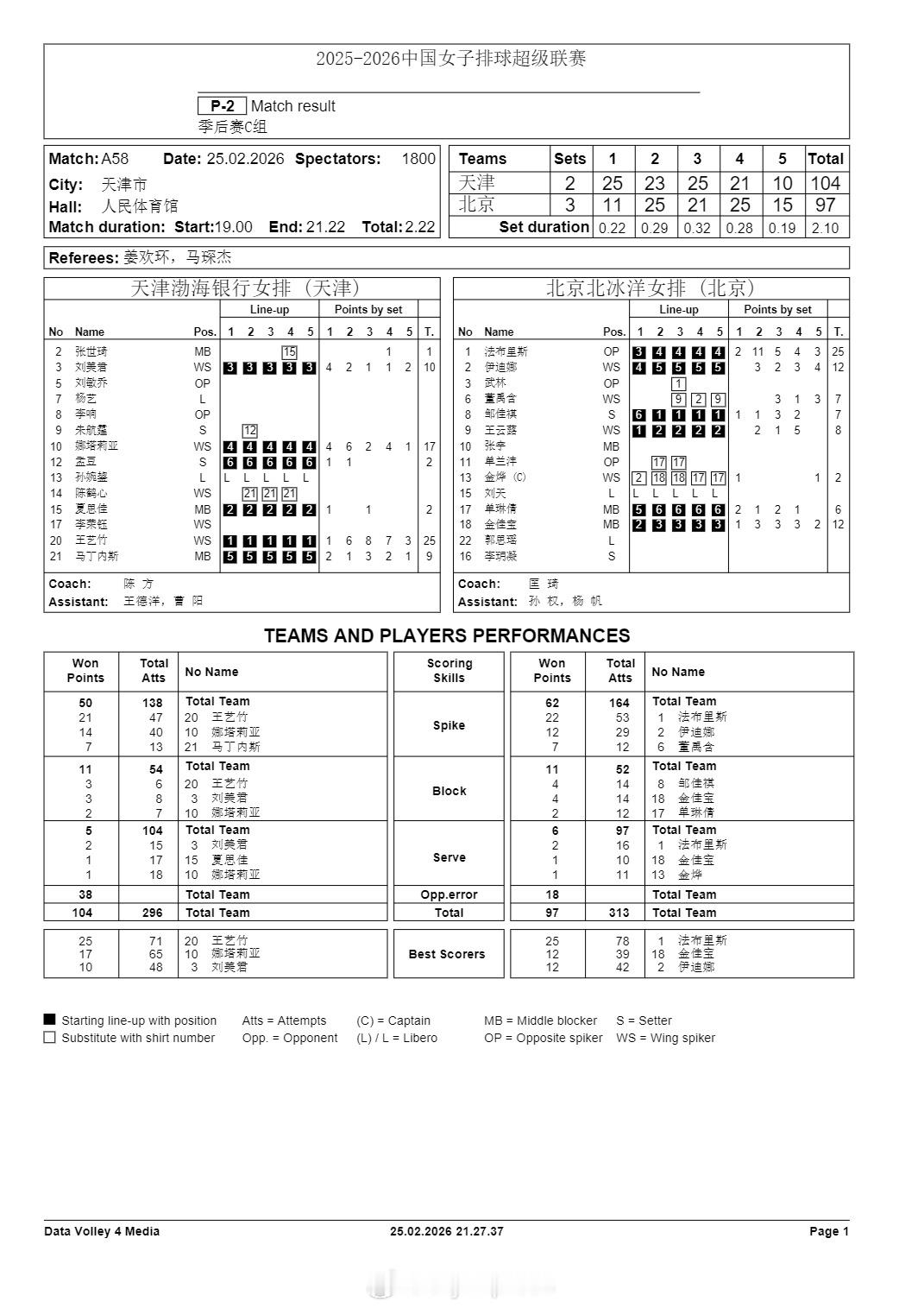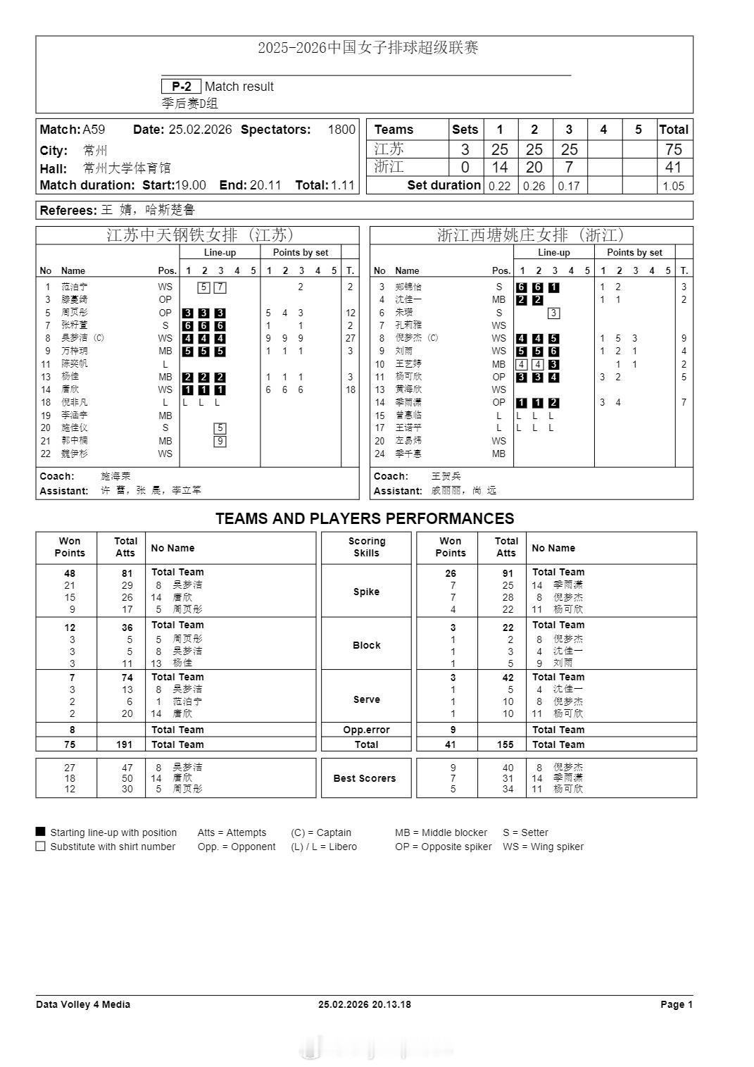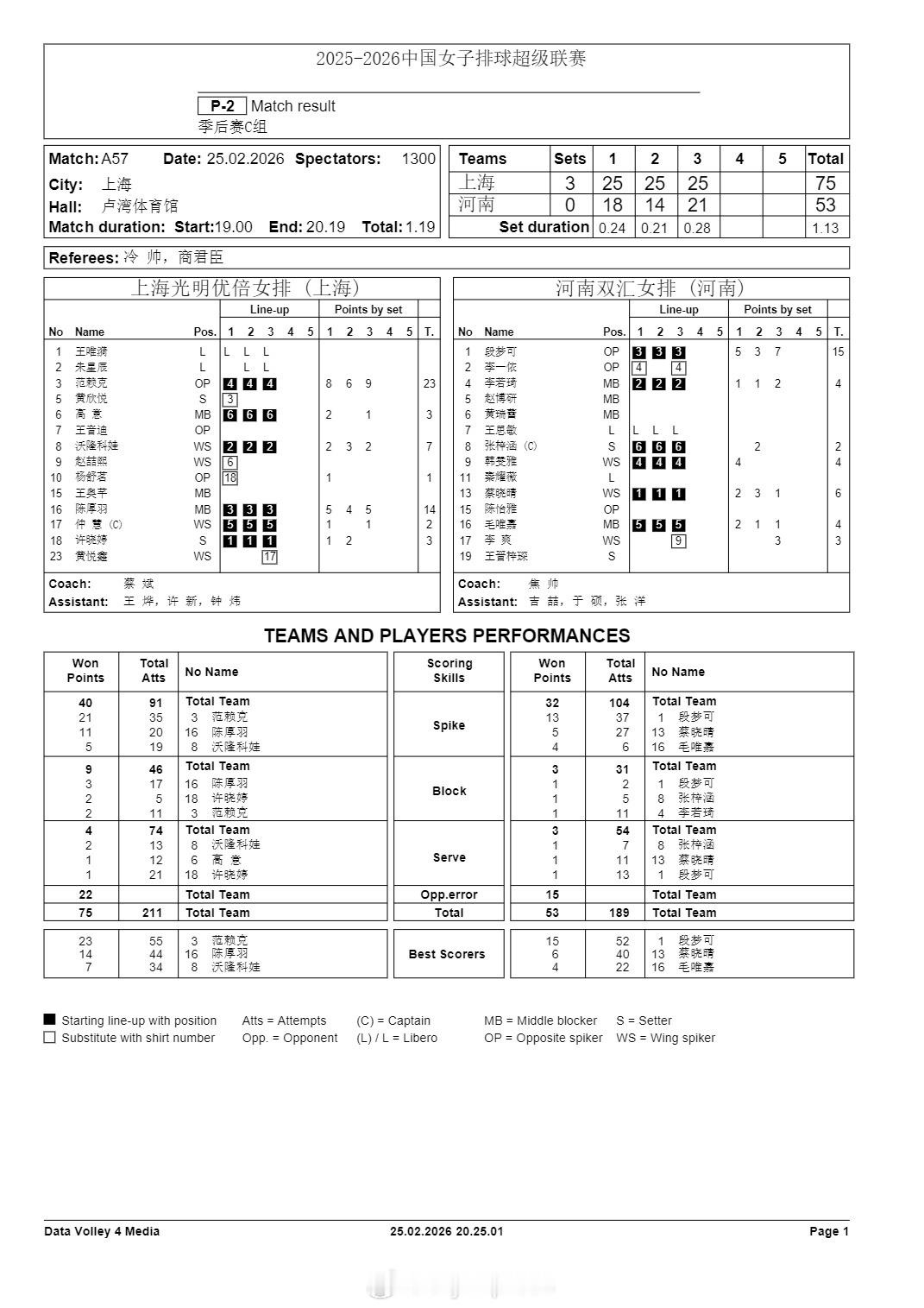 排超联赛 2月25日,女排联赛季后赛技术统计。
