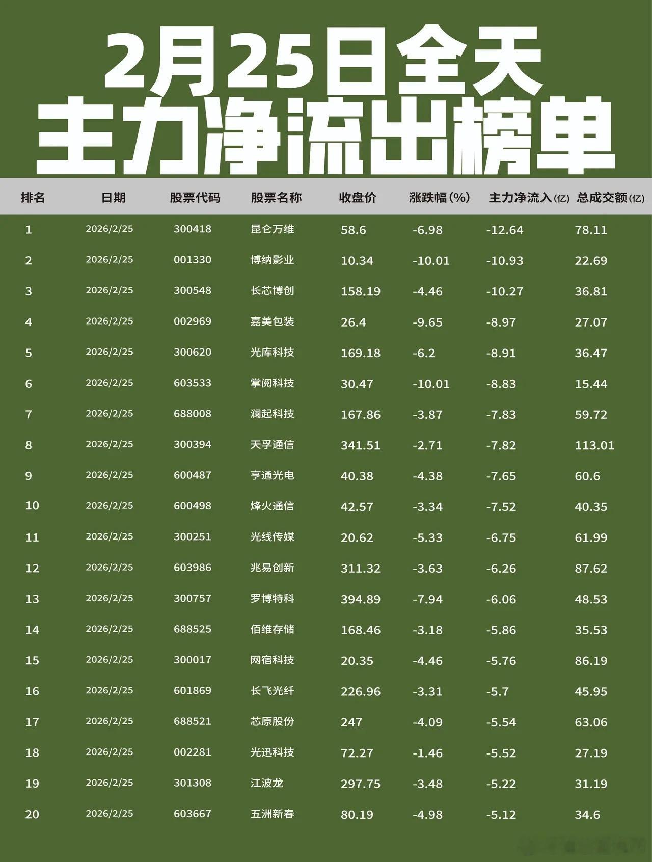 【2月25日全天主力净流入流出榜单出炉🔥】: 今日全天主力资金集中涌入资源周期方向。北方稀土净流入81.21亿元创阶段新高,包钢股份、风华高科、云天化等稀土、化工股获巨资抢筹,胜宏科技、沪电股份等科技股亦获资金回流。流出端,昆仑万维遭12.64亿元抛售领跌,博纳影业、光模块及AI应用端持续失血。市场风格加速切换,资金聚焦低位周期与涨价主线。