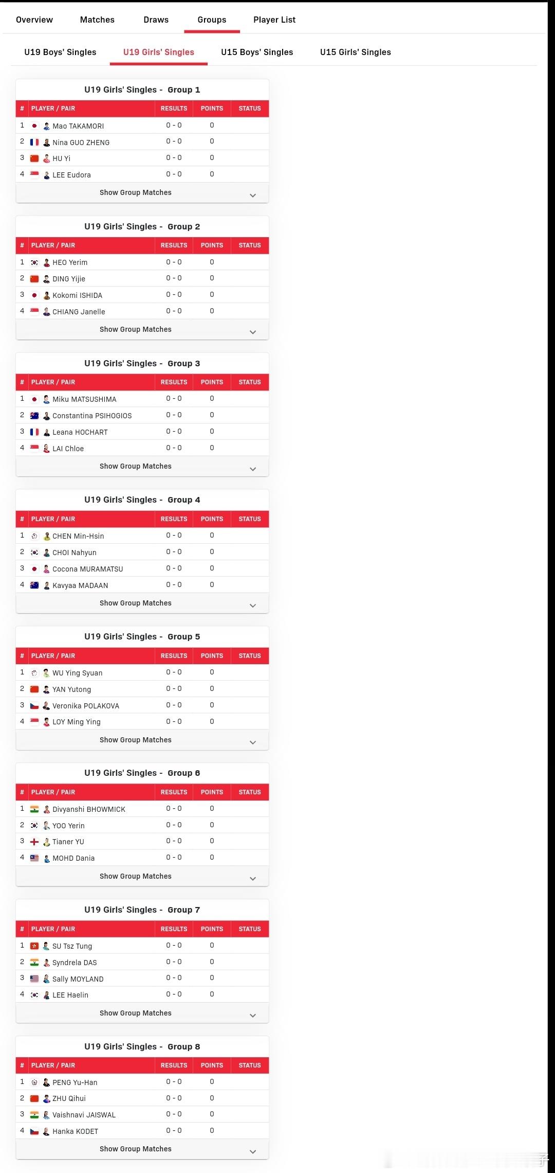 【女单】1组:胡一🇨🇳、高森爱央🇯🇵、郭铮🇫🇷、李英祈🇸🇬2组:丁怡婕🇨🇳、许玴玪🇰🇷、石田心美🇯🇵、张睿恩🇸🇬5组:闫禹橦🇨🇳、吴映萱(中国台北)、波拉科娃🇨🇿、黎明映🇸🇬8组:祝启慧🇨🇳、彭郁涵(中国台北)、贾伊斯瓦尔🇮🇳、科德特🇨🇿
