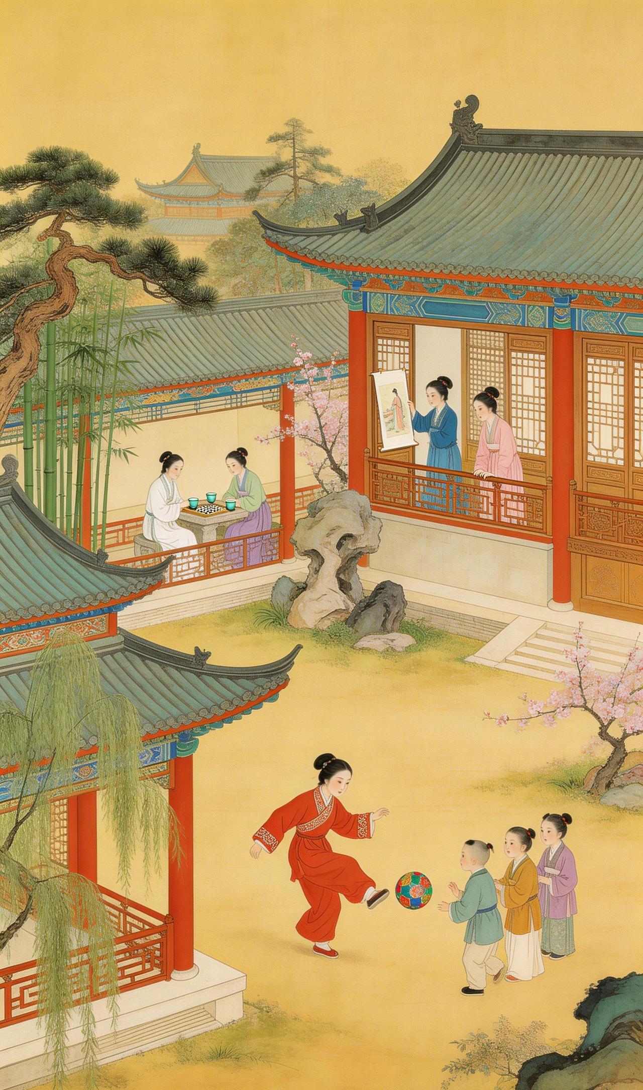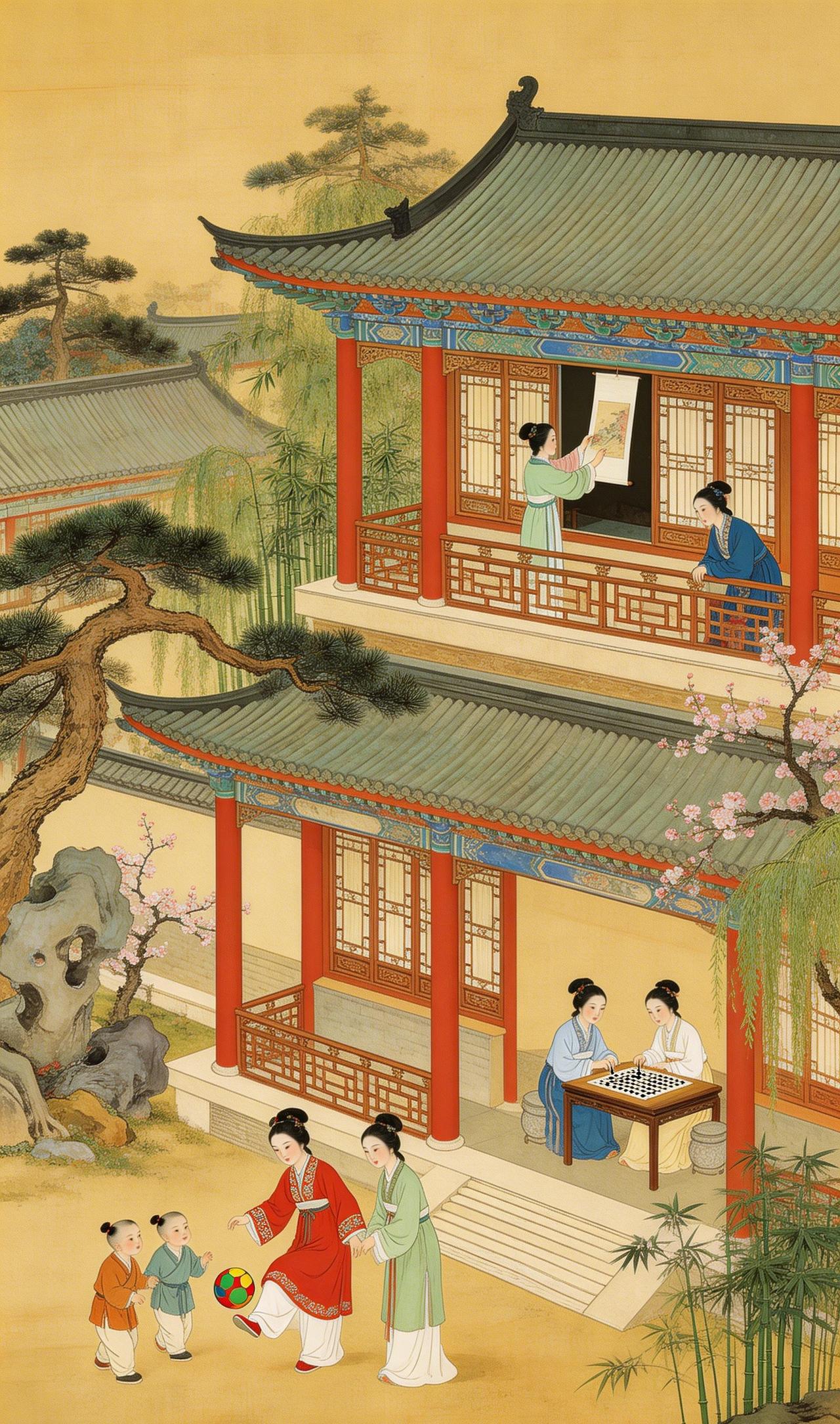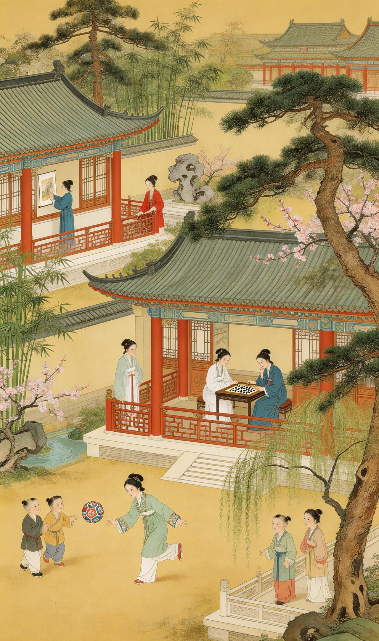 春庭撷影 春日午后,庭院深处浸着融融的暖意。青瓦红柱的亭台错落于光影之间,苍松虬曲,翠竹新绿,几枝粉白的桃花斜逸而出,与檐角相映成趣。溪流潺潺,水声隐约,绕着假山石畔缓缓流过。 庭院开阔处,浅绿罗裙的仕女正带着孩童蹴鞠。彩球轻巧地滚过青砖地面,孩童笑着追逐,衣角飞扬,仕女俯身轻拂,裙裾随微风漾开。亭中则是另一番静谧——两位仕女对坐弈棋,纤指落子,清脆有声;身旁侍女静静伫立,目光随棋局流转,连呼吸都放轻了。 循廊而上,二楼檐下,一位仕女缓缓展开画轴,凝神赏玩;另一位倚栏远眺,衣摆被风轻轻撩动,目光投向庭院深处。那里,殿宇的飞檐在薄雾中若隐若现,竹影摇曳,偶尔有几瓣桃花随风飘落,划过半空,归于青石小径。 春日的庭院,动静皆宜,处处是生活从容的注脚。 春日庭院