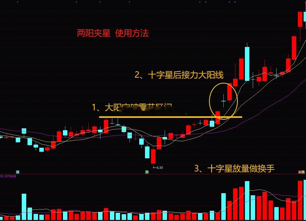 十字星K线大家应该非常熟悉了,关键是如何在强势行情中展现十字星的魅力呢?有这样一个方法叫做“两阳夹星”,在行情上涨初期或者中期的时候出现,容易诞生一轮强势拉升行情。 “两阳夹星”是怎么呈现的呢?在行情经过小幅上涨后,出现一根大阳线,紧接着是一根十字星,散户会对这个十字星比较迷惑,通常成交量会放大,让人误以为是见顶了;十字星再来一根实体较大阳线,这就形成了两阳夹星,表示主力接十字星快速完成洗盘,继续向上推进,不给回调的机会。
