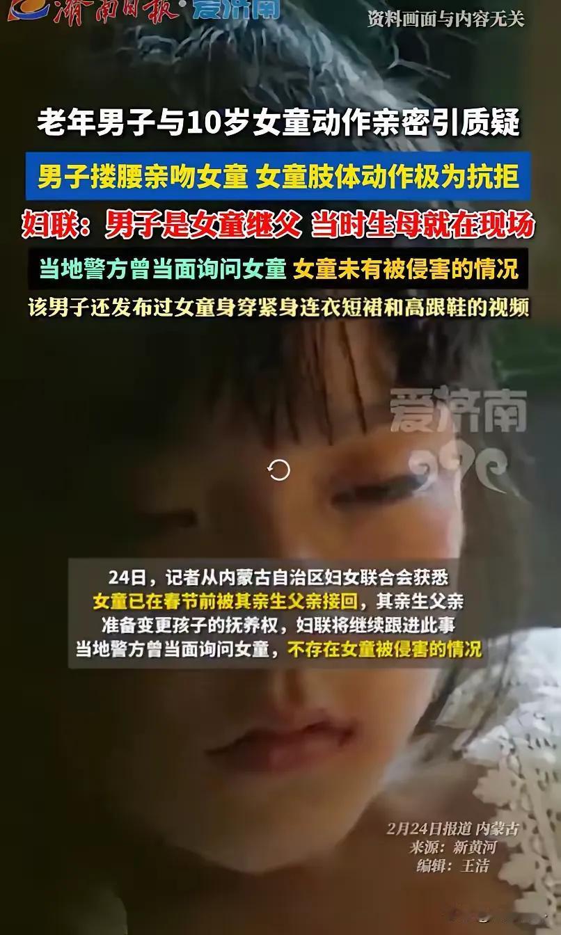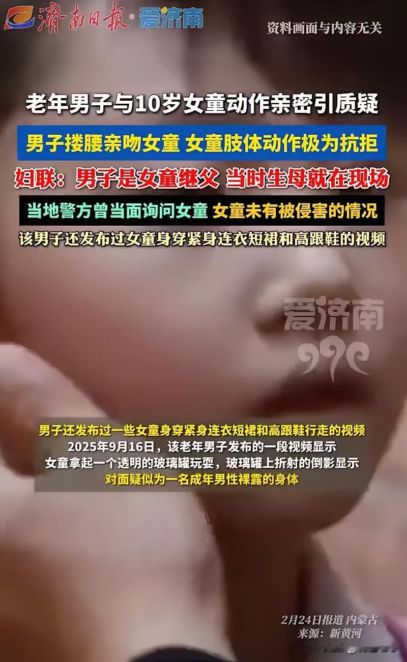 太不像话了!在内蒙古包头,一个六十多岁的继父对着十岁的继女动手动脚,亲妈居然还在旁边说是“拍着玩”?事件在网上发酵后,网友都怒了! 视频里的画面看得人血压飙升:继父搂着女孩的腰,脸凑得极近,试图亲吻她的脸颊。女孩明显在抗拒,身体往后缩,手也在用力推开,那种不舒服和害怕根本藏不住。更让人窒息的是,孩子的亲生母亲就在现场,面对网友的质疑,她轻飘飘一句“拍着玩呢”,就想把这事翻篇。 这哪是拍着玩?这分明是在消费孩子的边界感,甚至在践踏她的尊严。更离谱的是,这个继父还多次在网上发布女孩的视频,让她穿着紧身连衣短裙和高跟鞋走路,完全把孩子当成了博眼球的道具。有一段视频里,女孩拿着透明玻璃罐玩耍,罐子里折射出的倒影,疑似是成年男性裸露的身体,这细节一出来,谁看了不心里一紧? 妇联和警方的通报说,经过当面询问,女孩没有被侵害的情况,而且她已经在春节前被亲生父亲接走,生父正准备变更抚养权。可就算没有发生实质性的伤害,这种长期的边界模糊、不当接触,对一个10岁孩子的心理伤害,难道就可以被忽略吗? 最让人寒心的是孩子的亲生母亲。作为母亲,她本该是孩子最坚实的保护伞,可她却选择站在伤害者那边,用一句“拍着玩”来合理化继父的越界行为。她忘了,孩子的抗拒不是演的,她的不舒服不是装的。当母亲都不能保护自己的孩子,那孩子还能指望谁? 这件事之所以能引爆全网,是因为它戳中了所有人的底线。我们无法容忍一个本该充满爱的家庭,变成孩子的噩梦现场;更无法容忍,当孩子发出求救信号时,最亲近的人却选择视而不见。 各位读者你们怎么看?欢迎在评论区讨论。