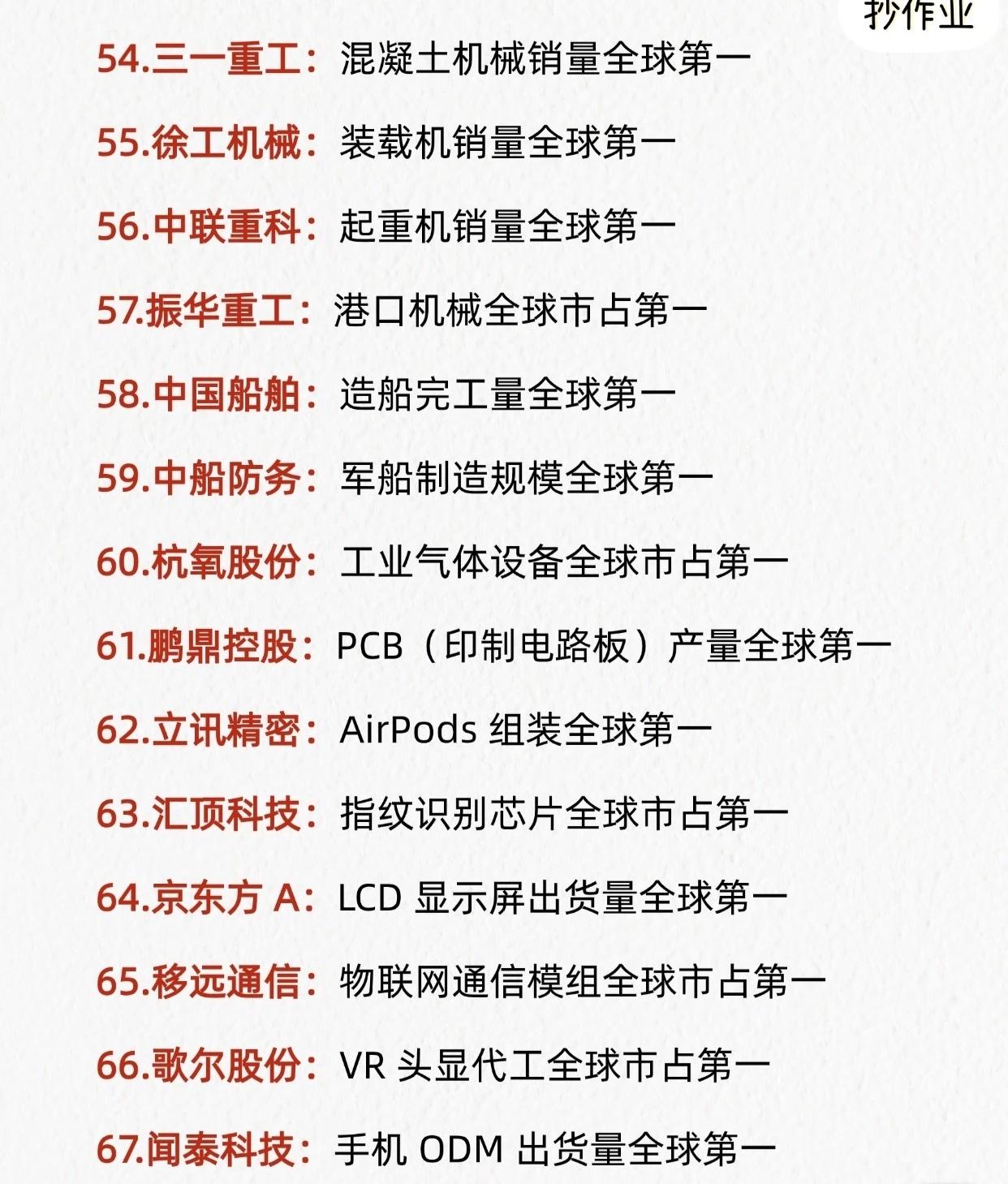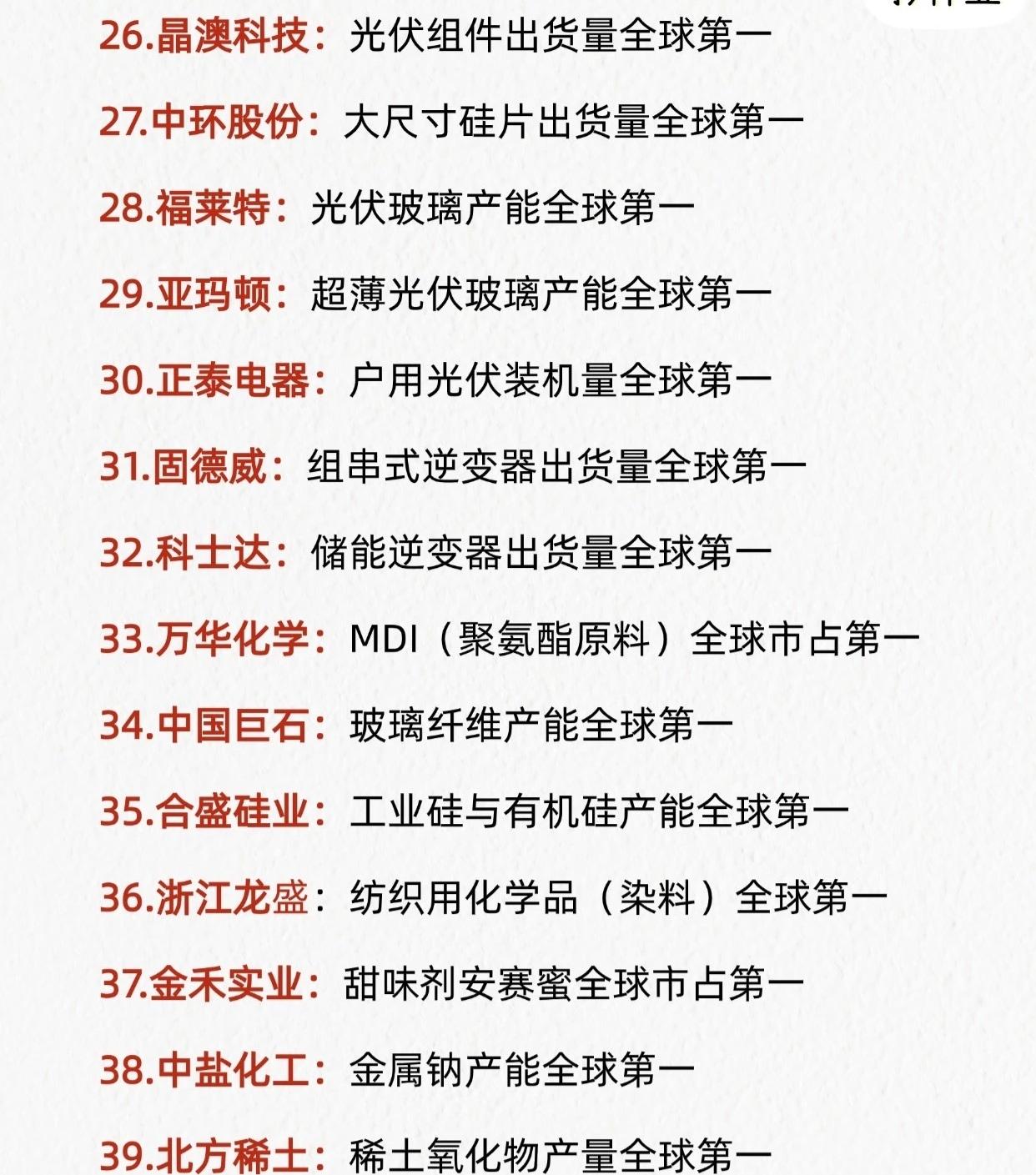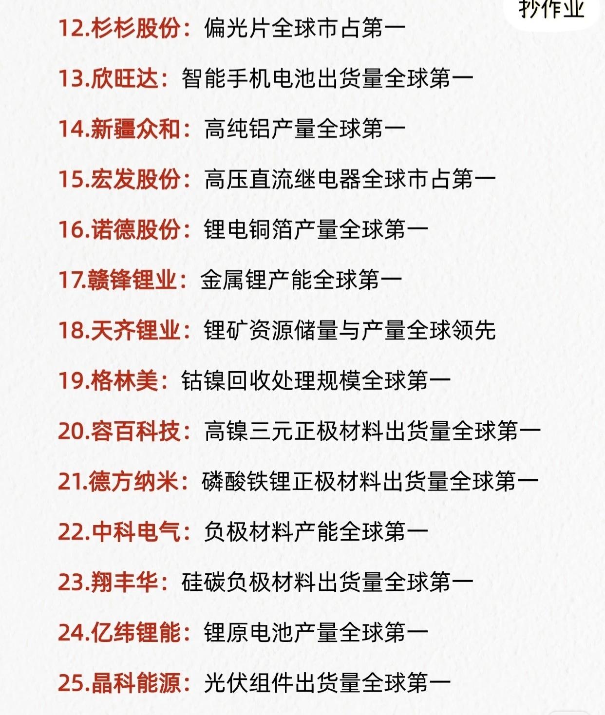 A股多家企业在全球细分领域的领先地位,覆盖新能源(锂电、光伏)、材料、化工、工程机械、电子科技等行业。 核心信息可概括为: - 新能源与光伏:宁德时代(动力电池装机量)、比亚迪(新能源车销量)、隆基绿能/晶科能源/晶澳科技(光伏组件出货量)、通威股份(光伏硅料与电池片)、阳光电源(光伏逆变器)、福斯特(光伏胶膜)、亚玛顿(超薄光伏玻璃)、正泰电器(户用光伏装机量)等均居全球第一。 - 锂电产业链:恩捷股份(锂电隔膜)、天赐材料(电解液)、鼎胜新材(锂电铝箔)、石大胜华(电解液溶剂)、赣锋锂业(金属锂产能)、天齐锂业(锂矿储量与产量)、容百科技(高镍三元正极)、德方纳米(磷酸铁锂正极)、中科电气(负极材料)、翔丰华(硅碳负极)、亿纬锂能(锂原电池)等领跑全球。 - 材料与化工:杉杉股份(偏光片)、新疆众和(高纯铝)、宏发股份(高压直流继电器)、诺德股份(锂电铜箔)、格林美(三元前驱体/钴镍回收)、万华化学(MDI)、中国巨石(玻璃纤维)、合盛硅业(工业硅与有机硅)、浙江龙盛(染料)、金禾实业(安赛蜜)、中盐化工(金属钠)、北方稀土(稀土氧化物)等全球领先。 - 工程机械与电子:三一重工(混凝土机械)、徐工机械(装载机)、中联重科(起重机)、振华重工(港口机械)、中国船舶(造船完工量)、中船防务(军船制造)、杭氧股份(工业气体设备);鹏鼎控股(PCB)、立讯精密(AirPods组装)、汇顶科技(指纹识别芯片)、京东方A(LCD显示屏)、移远通信(物联网模组)、歌尔股份(VR头显代工)、闻泰科技(手机ODM)等均为全球第一。 整体凸显A股企业在全球产业链关键环节的竞争力,尤其在新能源、高端制造等领域优势显著。