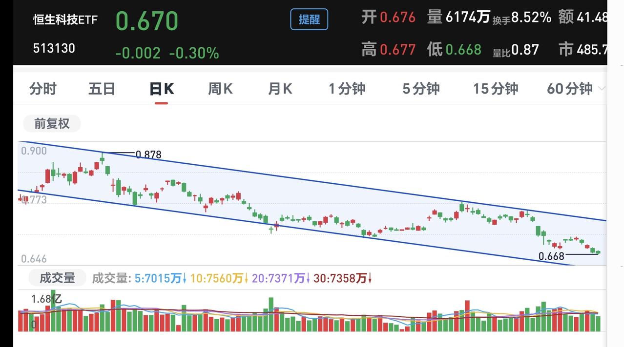 基金:恒生科技板块应该怎么办 欧洲市场现在上涨中,英国上涨了0.97%,德国上涨了0.43%,法国上涨了0.31%,上涨幅度都不大。 香港市场今天涨跌不一,恒生指数上涨了0.66%,国企指数上涨了0.30%,恒生科技下跌了0.19%,涨跌幅度也都不大。 恒生科技指数日线级别处于下跌通道中,距离下跌通道上下轨差不多远,想进场的人需要耐心等待,在上涨突破下跌通道上轨线的时候,可以考虑要不要进场,见下面的截图3。 恒生科技指数周线级别跌破上涨通道下轨线以后,形成了一个新的下跌通道,这个周线级别的下跌通道与日线级别的下跌通道是重合的,划线区间的时间段是差不多的,想进场的人也是要耐心等待上涨突破这个周线级别短期下跌通道的上轨线,见下面的截图4。 持有的基金净值大部分已经更新,上涨幅度最大的三个板块是:新能源汽车板块,可控核聚变板块,沪港深消费板块,下跌幅度最大的三个板块是:AI应用板块,芯片半导体板块,创新药板块,净值整体上涨了6214元。 看下面的截图7,这是今天加仓人数和减仓人数,今天加仓人数为36975835人,今天减仓人数为43843267人,加仓人数少于减仓人数,今天是难得见到的减仓人数多于加仓人数,说明有许多人已经在提前跑路。 我的观点认为,今天跑路的依据不足,虽然跑路的可能性在加大,但我现在整体仓位是半仓,没有足够的依据,我是不会进行再一次减仓的。 比如说,如果明天放量大涨,上涨幅度超过1.2%以上,那我明天就不会进行再一次止盈,再一次止盈的时间节点就要推后,到时候需要根据盘面的实际走势,结合成交量的变化,做一个综合性的判断。 市场如果从明天开始下跌,这个下跌的级别是不大的,市场如果上涨到4190点附近再开始下跌,那个下跌的级别会更大一些,如果从明天开始下跌,持有半仓的人可以不进行再一次止盈,如果上涨到4190点附近开始下跌,半仓的人也考虑进行再一次止盈,其实,这些都是预判,预判没有任何实际的意义,还是需要根据实际的走势做出及时的判断。 花1秒钟点赞,花30秒钟评论,就是对我最大的支持,谢谢大家的支持。