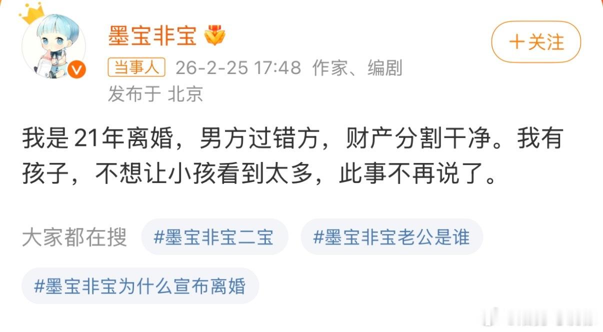 墨宝非宝宣布离婚天呐才知道她竟然离婚了 真的很喜欢她的小说 甜文写的超级棒 当年
