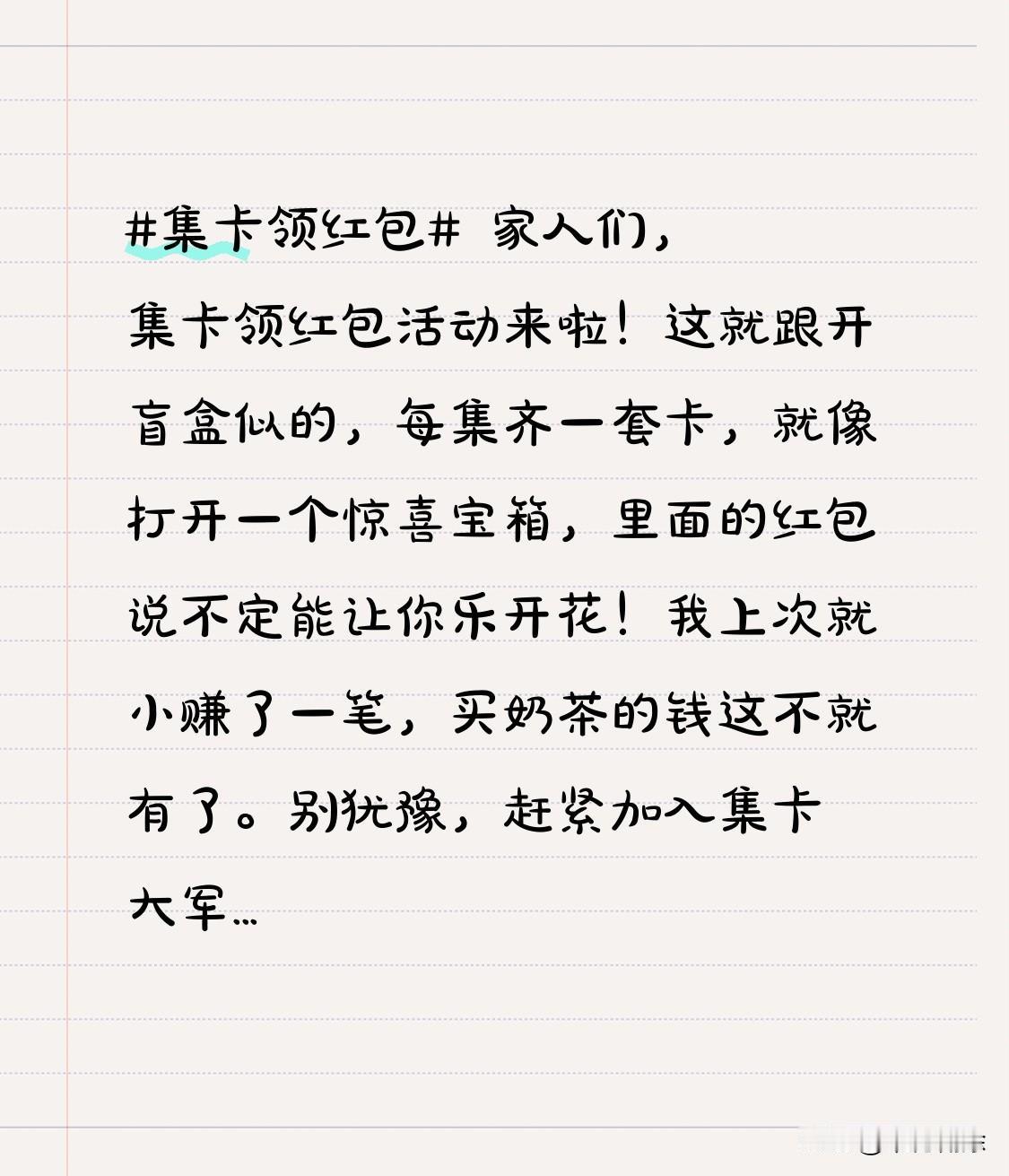 家人们,集卡领红包活动来啦!这就跟开盲盒似的,每集齐一套卡,就像打开一个惊喜宝箱,里面的红包说不定能让你乐开花!我上次就小赚了一笔,买奶茶的钱这不就有了。别犹豫,赶紧加入集卡大军,说不定下一个幸运儿就是你,一起把红包领到手软!