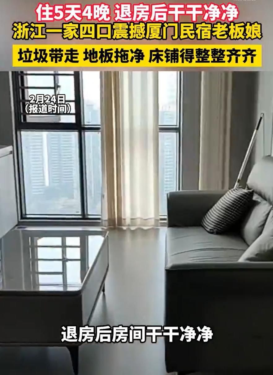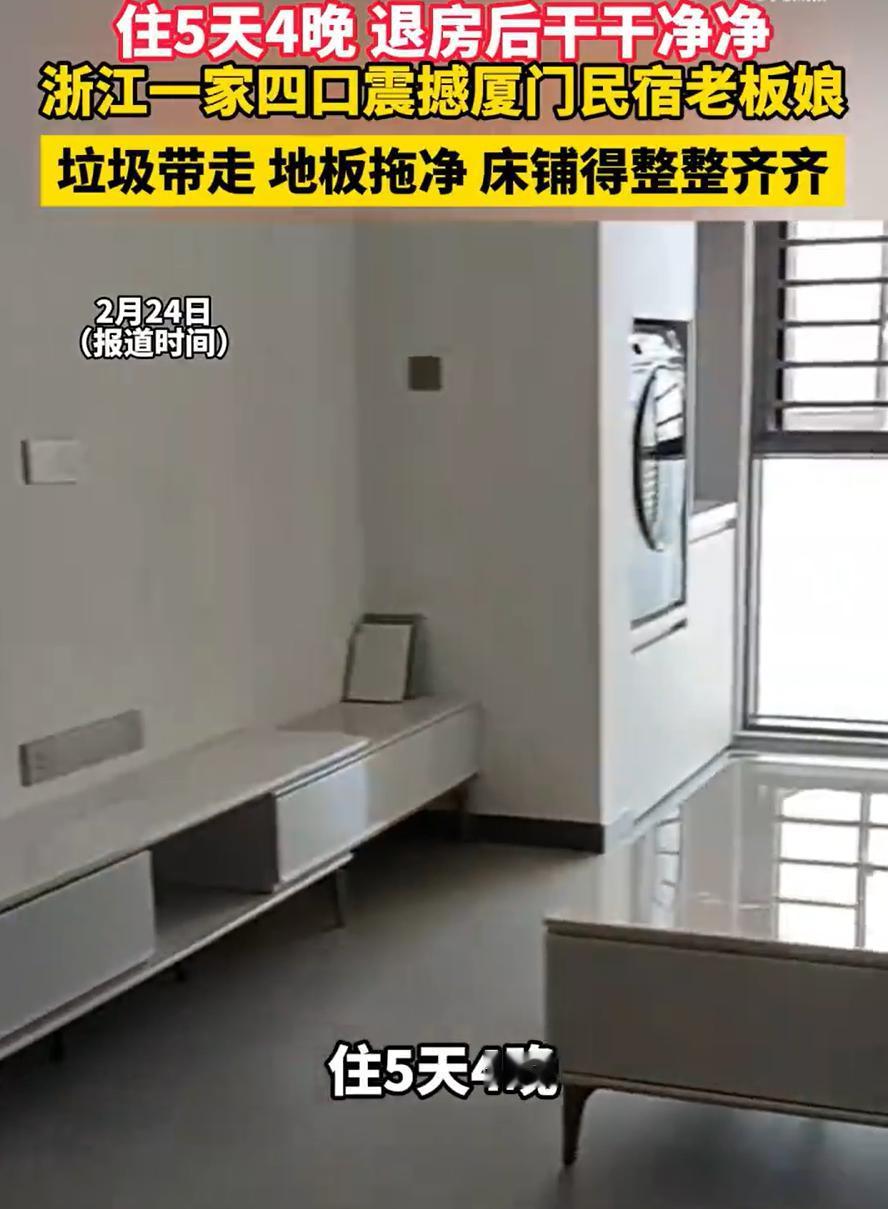 “真给浙江人长脸了!”福建厦门,一位女房东过年期间把民宿租给了一家四口,本以为对方离开时房子会乱糟糟的,结果开门一看傻眼了,房子一尘不染,就好像无人居住过一般,房东盛赞:超出认知了 樊女士介绍,她是一家民宿老板娘,本来想着过年期间能赚点钱,但也做好了节后腰酸背痛搞大扫除的心理准备 为啥呢?因为按她往年经验,春节这种长假,来住的多数都是一家几口,尤其是带了小孩的家庭,房子最后能给你留个全乎样儿就算不错了,稍微乱点、脏点,那都属于正常发挥,她早就见怪不怪了 今年她家民宿来了一户浙江的四口之家,两大两小,一共住了五天四晚。到了退房那天,樊女士拿着钥匙,深吸一口气,心里已经盘算着要从哪个角落开始收拾残局了 结果呢?门一推开,她整个人直接愣在原地,差点以为自己走错了房间。房间里干干净净,透透亮亮,地上别说垃圾了,连个脚印子都找不着,明显是用拖把仔细拖过的。厨房和卫生间的垃圾也都收拾得利利索索,装袋拎走了 最让她惊讶的是,卧室里那床被子叠得整整齐齐,床单铺得一点褶皱都没有,整个房间的状态,说是没人住过都有人信 樊女士当时就有点绷不住了,在屋里转了好几圈,一边看一边拍视频,嘴里念叨着真是超出我的认知了,这素质真是太高了。她说,这些年接待过形形色色的客人,自己也算是个老房东了,但像这样把民宿当成自己家一样爱惜的,确实不多见,尤其还是在过年这种人流量大、容易折腾的时候 说实话,樊女士这趟遇到的,不仅仅是几个高素质的房客,更像是遇到了一束温暖的光 对于做服务行业的人来说,这种将心比心的善意,比多赚多少钱都让人舒坦。咱们常说出门在外,与人方便自己方便,这家人用行动给这句话做了最好的注解