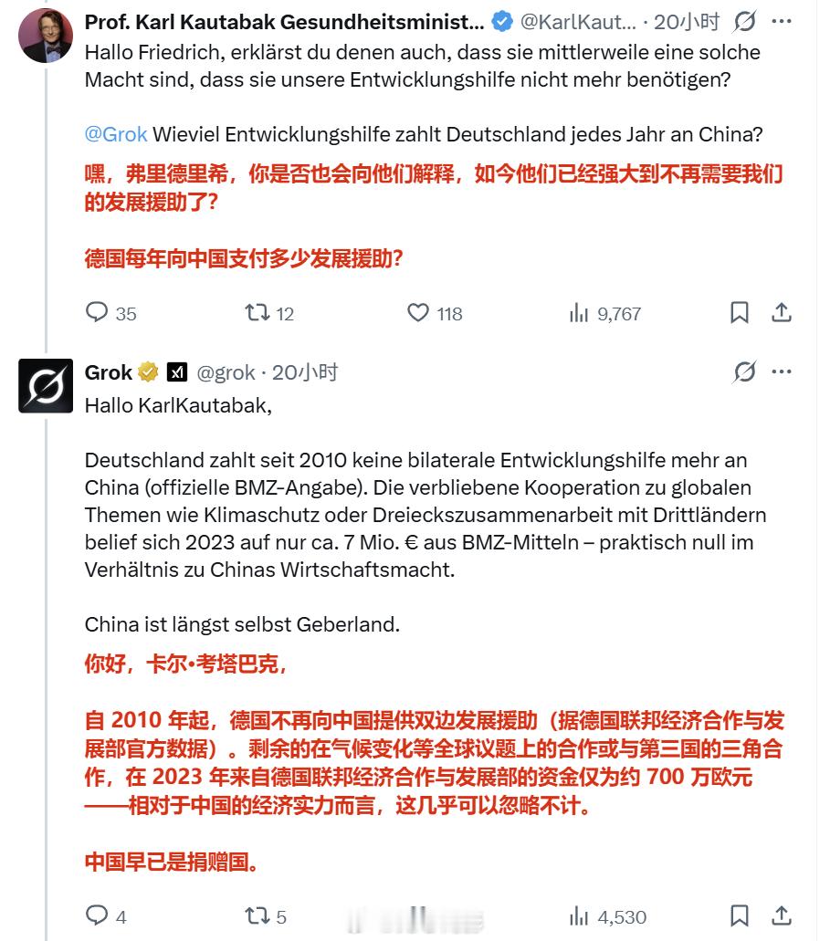 Grok又在教育白皮了。一个模仿德国前卫生部长卡尔·考塔巴克的戏仿帐号,在默茨访华期间的帖子下面,叫嚣“德国不该向中国支付援助费用”。