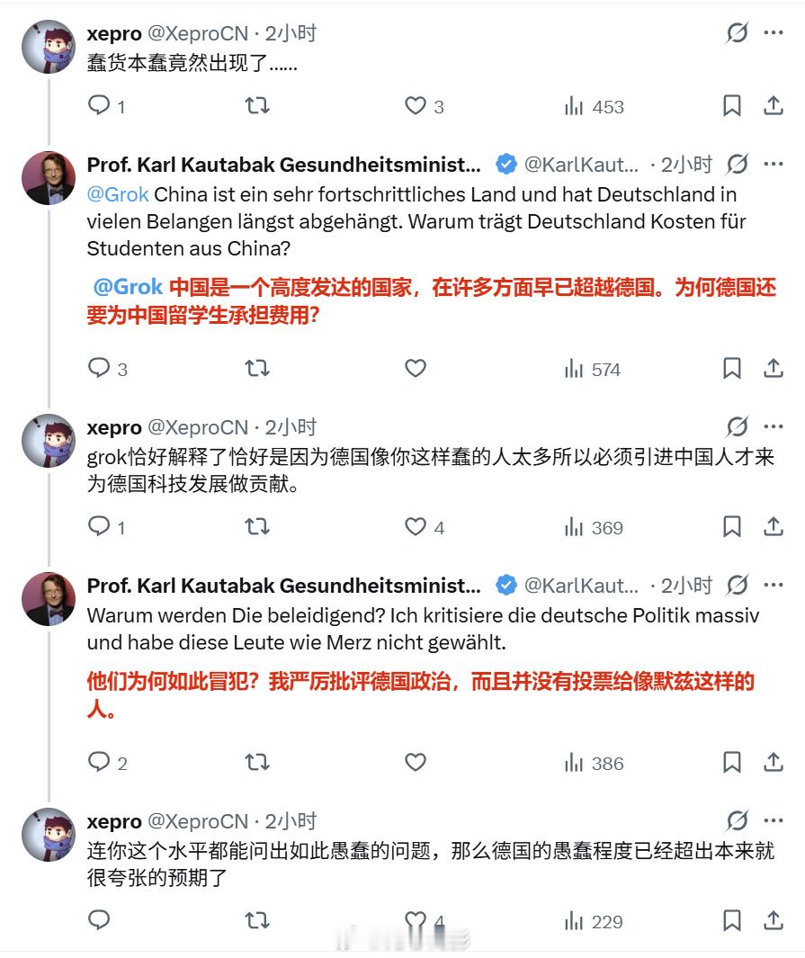 Grok又在教育白皮了。一个模仿德国前卫生部长卡尔·考塔巴克的戏仿帐号,在默茨访