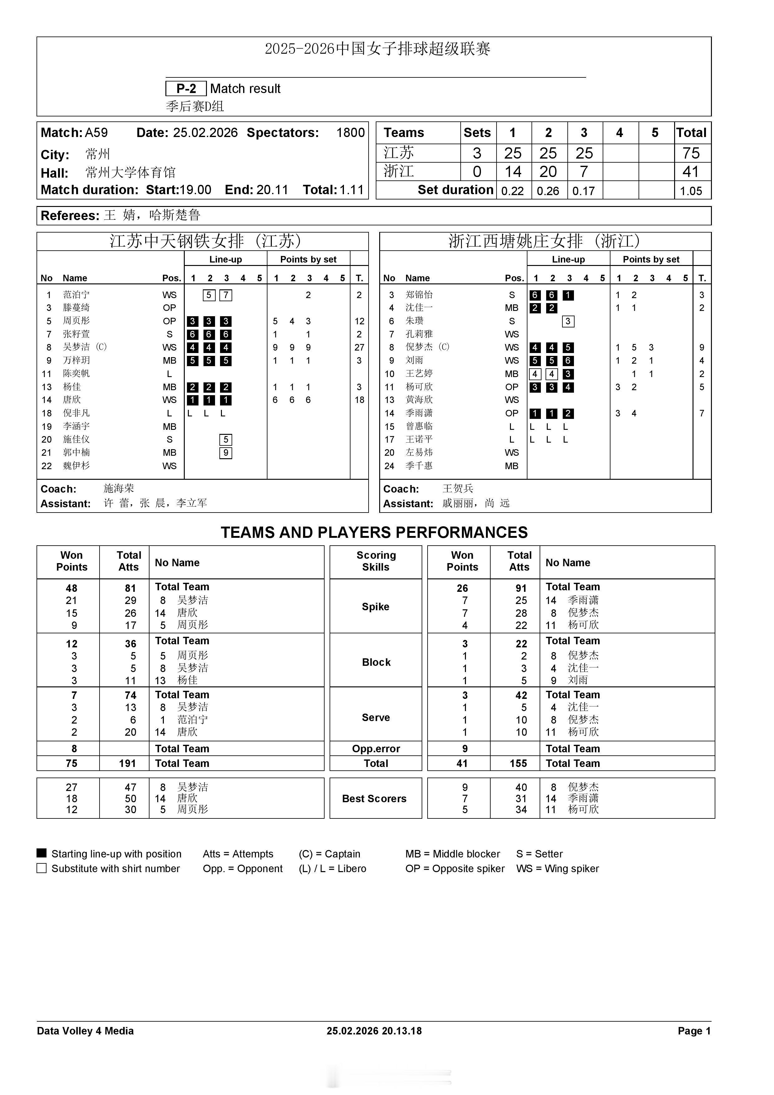 【中国女排超级联赛 江苏3-0浙江】25日晚,2025-2026中国女排超级联赛 A级季后赛总第15轮的一场比赛,D组的卫冕冠军江苏中天钢铁以3-0(25-14, 25-20, 25-7)横扫赛中升班马浙江西塘姚庄。吴梦洁27分,唐欣18分,周页彤12分;倪梦杰9分队内最高。
