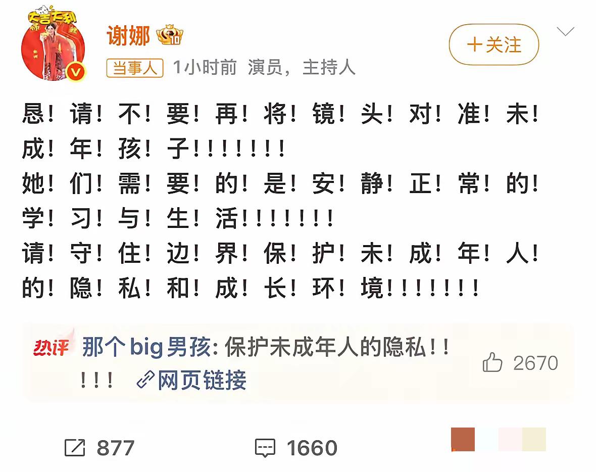 张杰和谢娜同时发文,这回是真生气了! 网友留言: 大部分都是支持谢娜和张杰, 如果有人再这样,建议他们报警。 未经别人允许,这是违法行为。 不过也有网友认为: 学学别的明星大大方方晒娃也没啥。 要不然两口子退圈吧, 这样关注度没了,就没人拍你们的孩子了。 这就是娱乐圈的现状, 有流量的明星才会被拍才会有这么大争议。 不过孩子又不是公众人物, 如果别人不让你拍, 你还跟踪偷拍这是违法行为。 我建议谢娜和张杰用法律武器保护孩子。