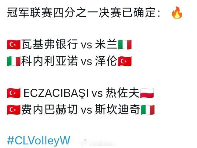 女排女排欧冠 8强对决🇹🇷瓦基弗银行vs米兰🇮🇹🇮🇹科内利亚诺vs泽仁🇹🇷