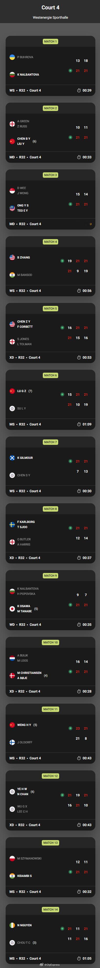 【德国赛25日国羽8胜1负 李诗沣一轮游】2026年德国羽毛球公开赛羽联超级赛 2月25日米尔海姆,2026世界羽联超级300德国公开赛结束次日比赛,国羽8胜1负,只有新赛季首秀的李诗沣落败。国羽赛果如下,完全赛果见图:男单:陆光祖15-21/21-10/21-19苏力扬(中国台北)翁泓阳23-21/21-8奥尔多夫(芬兰)李诗沣16-21/15-21古贺穗(日本)女单:王祉怡21-9/21-14米尔(印度)韩千禧21-19/19-21/21-18林湘缇(中国台北)韩悦21-11/21-10威尔逊(德国)男双:陈柏阳/刘毅21-10/21-11格林/鲁斯(英格兰)混双:程星/张驰21-12/21-18克拉克斯/莱赫曼(德国)郭新娃/陈芳卉21-17/21-13加西亚/罗德里戈兹(西班牙)
