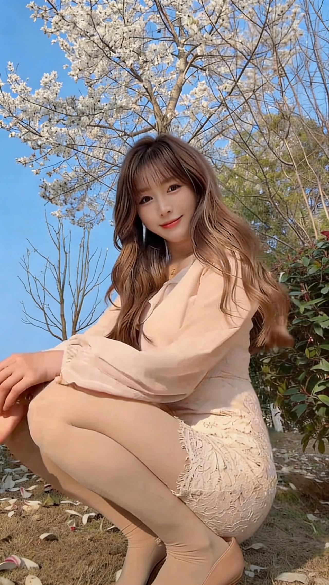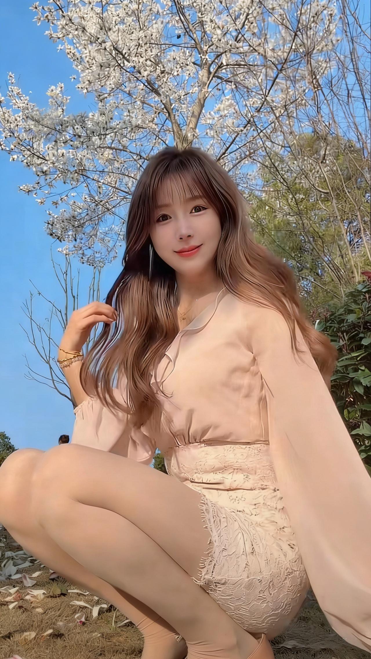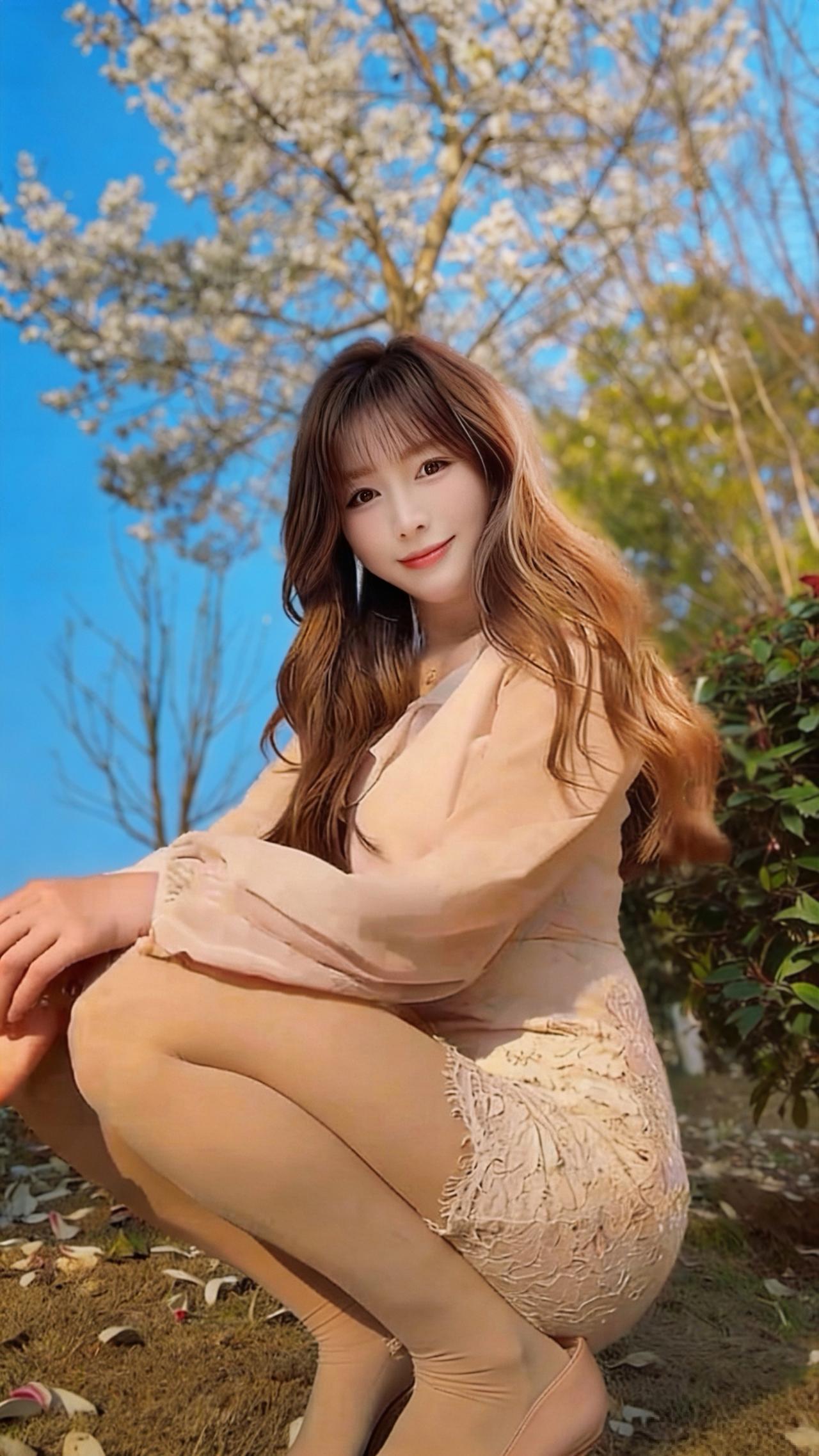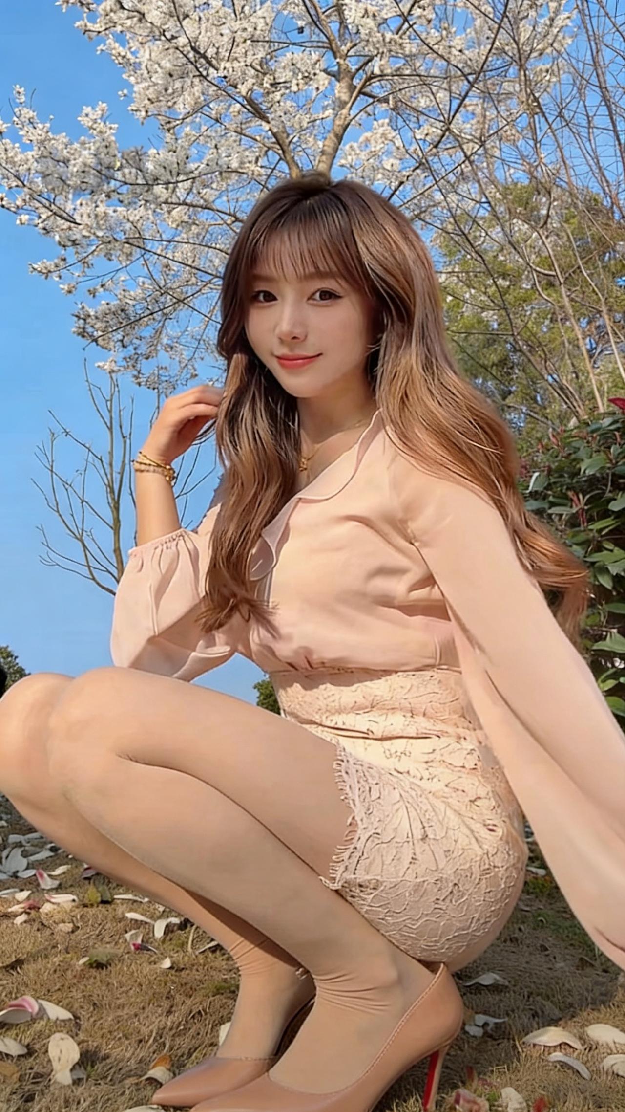 你是喜欢御姐风还是温柔风?这位小姐姐就像春日里的樱花,温柔又灵动,美得让人移不开眼🌸 她有着一头浅棕带粉调的长卷发,空气刘海自然垂落,衬得脸庞愈发小巧精致。一双杏眼清澈明亮,眼尾微微上挑,眼妆温柔又不失灵动,皮肤白皙细腻,透着淡淡的粉晕,唇色是温柔的豆沙粉,笑起来时眼波流转,像藏着星光,甜得让人忍不住心动。 她身着浅粉色雪纺衬衫,荷叶边领口增添了几分柔媚,宽松的灯笼袖随风轻扬,下搭同色系蕾丝短裙,精致的蕾丝花纹与毛边设计,既显温婉又不失少女的俏皮。肉色丝袜与裸色红底高跟鞋的搭配,勾勒出修长纤细的腿部线条,整体造型温柔又带着一丝恰到好处的小性感。 在蓝天与盛放的花树映衬下,她时而轻撩发丝,时而浅笑回眸,蹲在落满花瓣的草地上,每一个姿态都自然又治愈,像从春日画报里走出来的少女,自带松弛又甜美的氛围感,让人仿佛能闻到空气中淡淡的花香。