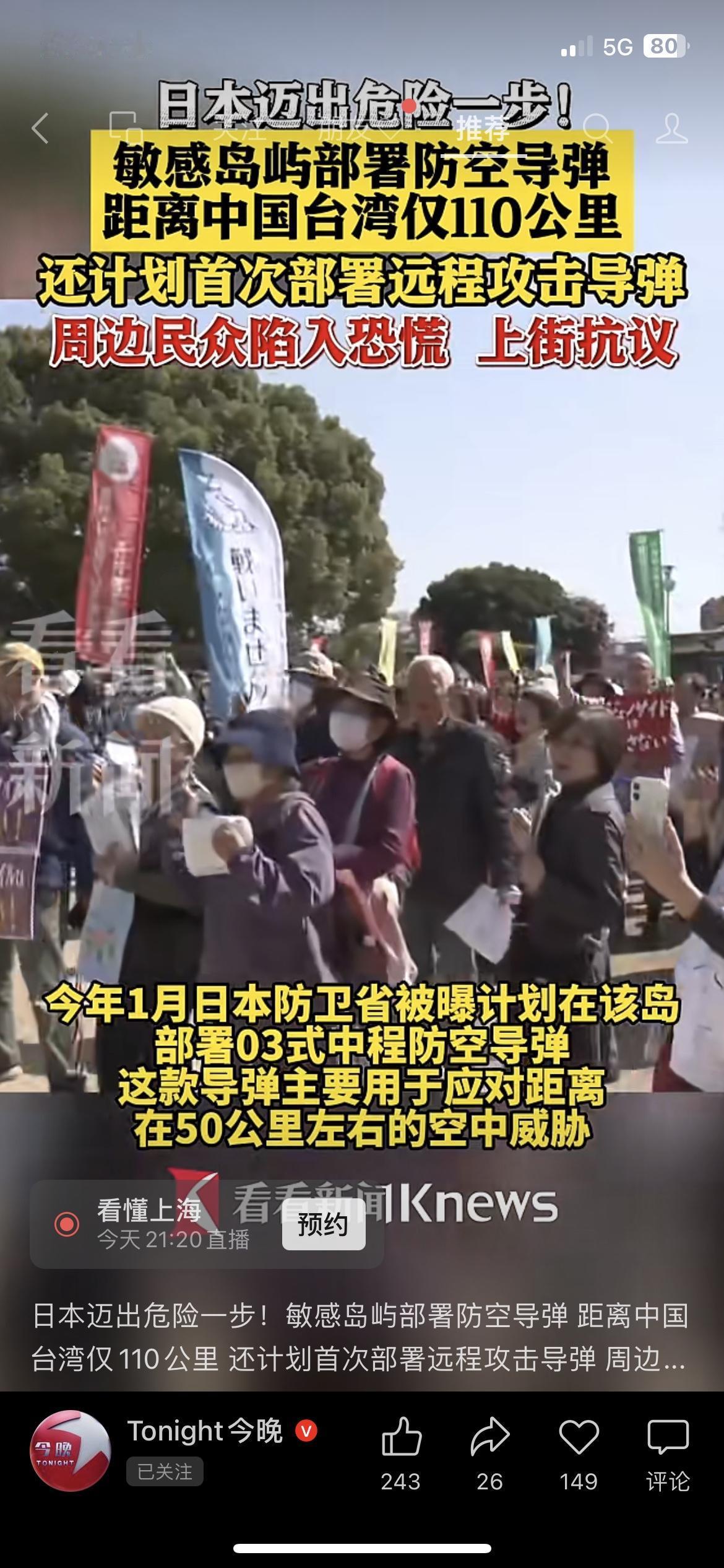 日本在距台湾仅110公里的与那国岛部署防空导弹,还计划首次部署远程攻击导弹,周边民众陷入恐慌,上街抗议。我看到这个新闻,直接皱起了眉头。日本的这一步,不利于地区和平稳定,也引发周边国家和民众的担忧。任何破坏地区和平与稳定的行为,都不符合各方共同利益。你怎么看待这件事?评论区和我聊聊。 日本 地区和平