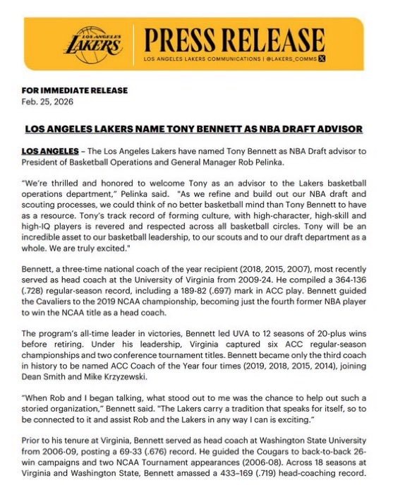 湖人官宣任命托尼·贝内特担任球队选秀顾问。