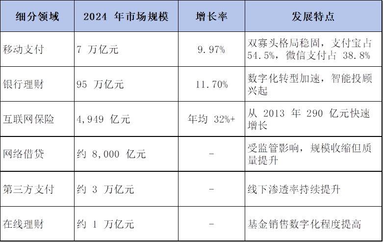 截至2025年底,中国互联网金融市场规模呈现出多元化、规模化的发展特征。根据不同统计口径,市场规模数据存在一定差异,但总体呈现快速增长态势。