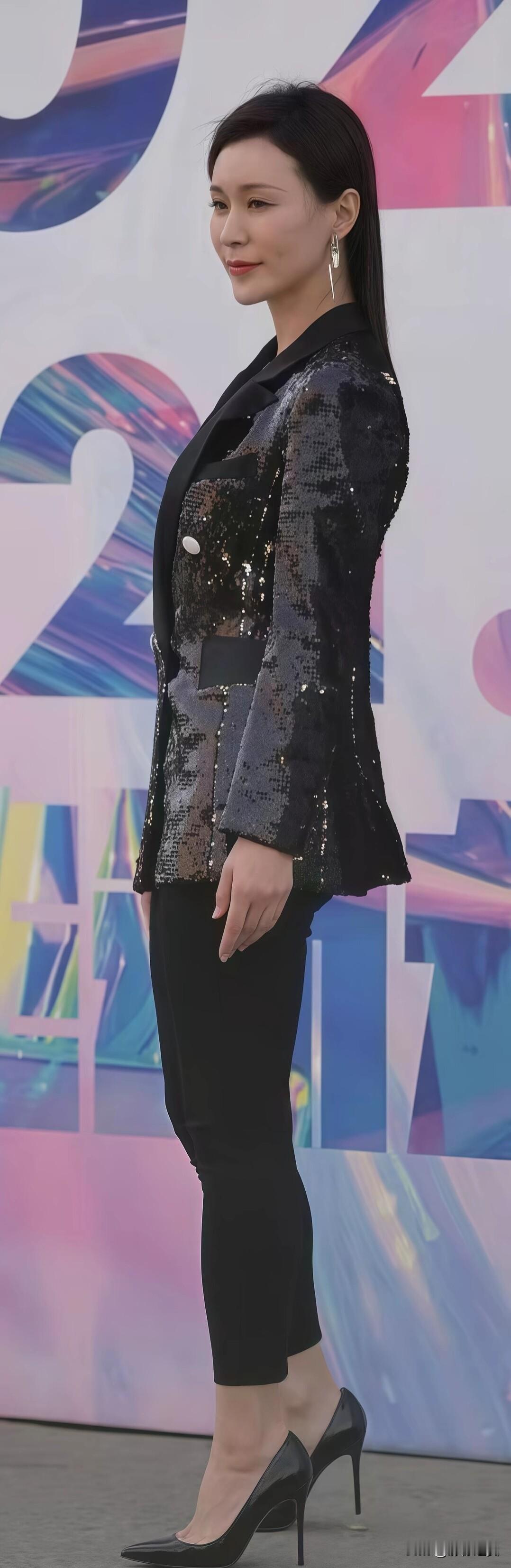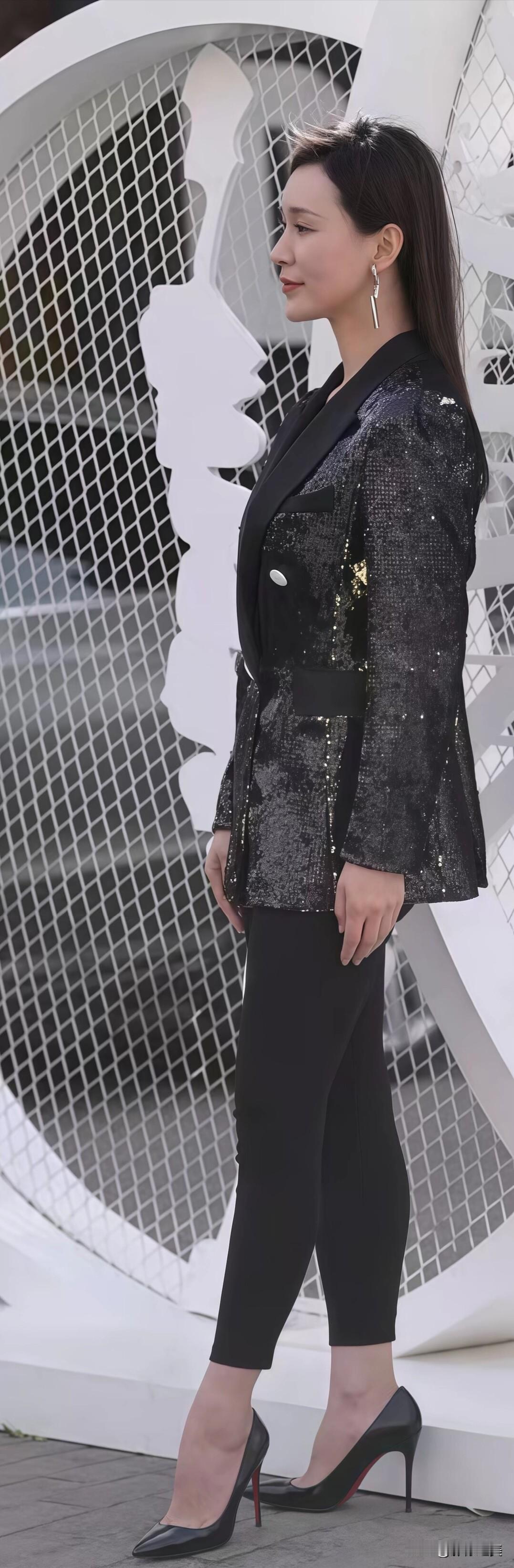 黑色亮片西装搭配黑色裤子,简约又有亮点。脚踩黑色高跟鞋,整体造型利落大方,很有气