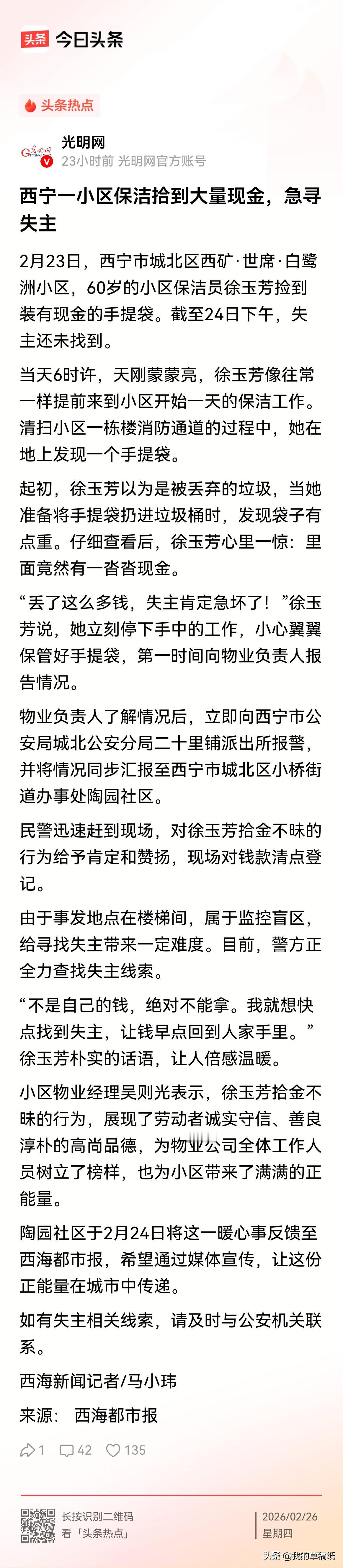 事发西宁!保洁阿姨捡到巨款,接下来的操作令人怒赞! 西宁市城北区西矿·世席·白鹭洲小区,60岁的保洁员徐大姐,天亮前扫楼梯,捡到一袋子钱。换别人,可能就揣兜里了,反正没人看见。可她想都没想——不是自己的,绝对不能拿! 六十年,她活明白了这个理儿。 徐大姐一个月挣多少钱?不知道。但肯定不是大数目。每天弯腰扫地,风吹日晒,挣的是辛苦钱。可面对那厚厚一沓现金,她没动心,第一时间上报,交给警察。这心,比那袋子钱干净多了! 有人说她傻。我不觉得。 这世上,有些人腰缠万贯却偷税漏税,有些人衣着光鲜却满嘴跑火车。徐大姐呢,穿着工作服,拿着扫帚,在最不起眼的岗位上,却守住了最金贵的底线——良心。 她说的那句话,简单却戳心:“就想快点找到失主,让钱早点回到人家手里。” 我琢磨着,这钱要是我的,我一定记住:是一个扫地的阿姨,让我这年过得踏实了。 徐玉芳,这名字真应该上西宁好人榜!不是因为捡了多少钱,是因为她在没人看见的角落,依然选择做一个好人。 咱们老百姓,就得为这样的好人点赞,让正能量传下去!