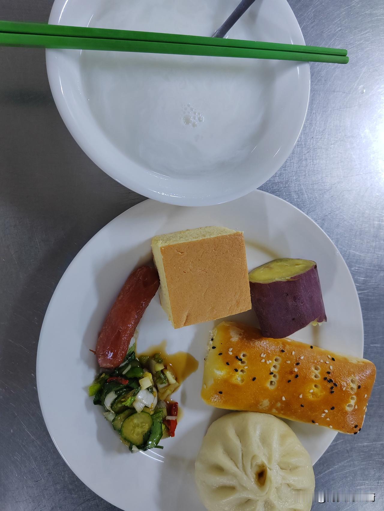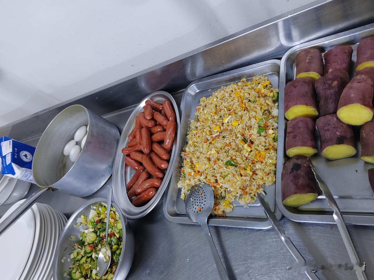 5:20分闹钟叫了,我揉了揉睡意朦胧的双眼,迅速的穿衣起床,到了厨房就像旋转的陀螺一样,一分钟都不能停下来,因为这一个半小时我必须要把早餐做好,让兄弟们准时吃饭! 7点钟准时开饭,把早餐盘摆好,擦了擦案子,刚拿出手机准备拍照,这时有个哥们来吃早餐了,看到我要拍照,给我让了几秒钟,接着对我说,大厨,粉丝先吃!粉丝先吃! 他的这一句话给我逗乐了。我拍照发头条是想让更多朋友知道,跑船虽然辛苦,但我们吃得一点都不马虎。每天早起备餐、煮粥、煮鸡蛋、煎香肠、蒸包子、炒饭、做蛋糕(昨晚提前烤好)、烤饼,蒸地瓜,小咸菜把简单的食材做得好吃有味,看着大家吃得满足,做大厨我心里也踏实。 海上生活单调,能通过网络和粉丝分享船上的日常,也是一种快乐。粉丝先“品尝”,船员们再大口吃,都是我最在乎的人。在船上做饭,讲究的就是实在、管饱。 感谢大家一直关心我们跑船人的生活,每天不定时更新,带你们看看船上的早餐到底怎样!