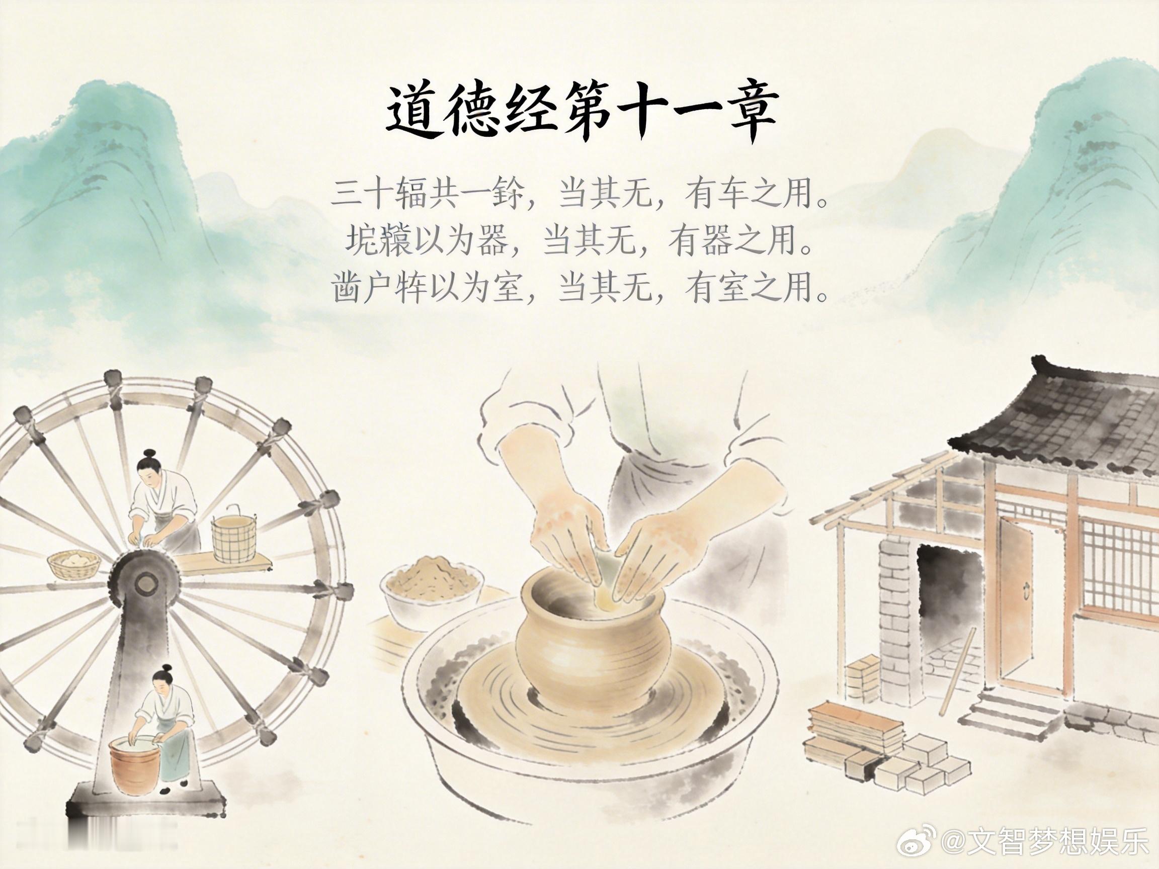 📜 原文+注音(第十一章)sān shí fú gòng yī gǔ,dāng qí wú,yǒu chē zhī yòng。三十辐共一毂(gǔ),当其无,有车之用。shān zhí yǐ wéi qì,dāng qí wú,yǒu qì zhī yòng。埏埴(shān zhí)以为器,当其无,有器之用。záo hù yǒu yǐ wéi shì,dāng qí wú,yǒu shì zhī yòng。凿户牖(yǒu)以为室,当其无,有室之用。gù yǒu zhī yǐ wéi lì,wú zhī yǐ wéi yòng。故有之以为利,无之以为用。🔍 译文三十根辐条汇集于车毂,正因为毂的中空,才有车轮转动、车子行驶的作用。揉和黏土做成器皿,正因为器的中空,才有盛装物品的作用。开凿门窗建造房屋,正因为室内虚空,才有居住使用的作用。所以,“有”(实体)提供便利条件,“无”(虚空)才是发挥功能的关键。🧠 速记卡(一句话+要点)一句话核心:有是利,无是用;实体为基,虚空显功。三喻速记:- 车:辐毂为有,毂空为无 → 车行