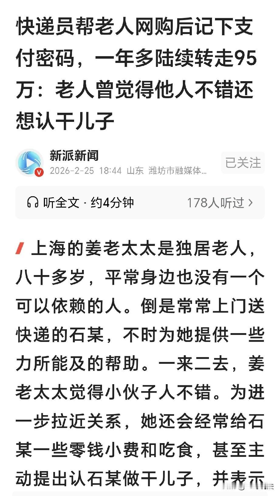 “一手好牌打的稀烂!”上海,一80岁老太太独自居住,一快递员经常帮她网购,老太太心里感激,她告诉快递员,自己有两套房子,还会炒股,想认快递员当干儿子,不料,快递员记住了她支付密码,利用帮忙的时候,不断给他自己转款,被发现时,已经转走老太太95万,他自己消费,还高利贷,给女主播打赏,将钱挥霍一空,老太太发现不对,立刻报警!网友:老老实实的做干儿子,说不定两套房就到手了,没有富贵命! 姜老太太已经80多岁,她独自居住,照目前来看,身体还算是相当的不错。 可是,她毕竟年纪大了,老眼昏花,在生活上还是多有不便。 石某是一名快递员,经常给姜老太太送快递,一来二去,姜奶奶就和石某渐渐的熟悉。 石某嘴甜,每次送快递时总是叫她姜奶奶,时不时帮她干点小活,搬搬东西,修修水管,哪里有不合适,他都会主动帮忙。 时间一长,姜老太就有了一份念想,她独自一人,石某送快递时总会和她聊上一会。 不久之后,姜老太觉得这小伙子人真不错,为人厚道踏实,姜老太对他十分的信任。 姜老太甚至想过,自己的生活没有依靠,她不差钱,差的是一份亲情。 从此她就有了想法,她甚至想过,不如认石某当干儿子。 于是姜老太对石某更加的喜爱,时常会给他一些小费和零钱,在姜老太心里,这是她对石某的感激喜爱之情。 姜老太告诉石某,自己名下有两套房子。 她还表示,她的房子可以让石某居住,这样石某也就能方便照顾自己。 姜老太说者无心,石某确是听者有意,他已经看了出来,姜老太是个不差钱的老人。 她缺少的是温情,是陪伴,是环绕在她身旁,让她感受到有亲人的呵护。 之后,姜老太要学习网购,她虽然年纪大了,依旧还想赶赶时髦。 她翻了翻手机,网购平台上有一个茶几,让她心里十分的喜爱。 她拿出手机,可手足无措,她不知道该怎么买下,又该如何把钱打给对方方。 刚好石某上门送货,姜老太给他手机,还把自己的密码告诉了石某。 石某一看,老人对他如此的信任,他拿过手机,帮姜老太购买成功。 他知道了密码,心生了歹念,他很好奇,不知道老人到底有多少钱的财物。 这个时候,石某暗自记住了密码,从此以后,他就开始记挂姜老太的养老钱了。 他趁着姜老太太不注意,用她的微信给自己转账,每次金额不大,几百到几千不等。 开始的时候,石某心里还有些害怕,做贼心虚的他每次转完钱都会提心吊胆好几天。 但随着时间的推移,他发现姜老太太根本没有察觉,胆子也就越来越大,转账的频率和金额都不断增加。 这样的情况持续了一年多。直到2025年9月的一天,姜老太太去银行取钱时,发现工资卡里的钱少了许多。 她心里“咯噔”一下,怀疑自己被骗了钱,赶紧报了警。 即便如此,姜老太太仍然十分信任石某,还打电话把这件事告诉了他。 石某做贼心虚,听到这个消息后慌了神。他匆忙赶到姜老太太家,把自己微信里所有的余额6000余元转给了姜老太太。 姜老太太看到钱被转了回来,以为只是自己不小心弄错了,便没再深究。 然而,石某的贪念并没有就此打住,没过多久,姜老太太又打电话给石某,请他上门帮忙在手机上买菜。 石某来到姜老太太家,在操作手机的过程中,他看到一条银行卡余额提醒短信,那里显示,姜老太卡里有二三十万! 石某急了,贪念又起,他肆无忌惮,立刻又给自己转钱。 不久,石某欠款太多,朋友催他还钱,石某又找了借口,匆匆来到了姜老太的家里。 他趁老人不备,用了两次的时间,转走了姜老太9万余元。 但纸终究包不住火,姜老太终于察觉到了资金的异常。 到案发时,石某已经转走姜老太钱款95万元,他丧心病狂,把这些钱,早就花的七七八八。 他自己花,买各种消费品,他还用来还高利贷,给女主播打赏,等发现时,钱早就没了。 姜老太太怎么也没想到,自己如此信任的“干儿子”竟然会做出这种事。 石某盗窃他人财物,数额特别巨大,检察机关以盗窃罪对石某提起了公诉,等待他的是法律的惩罚。 有人认为,老老实实的做干儿子,说不定两套房就到手了,没有富贵命! 更有人说,因小失大,好好照顾老人多好,人家也不会亏待你的。 若要人不知,除非己莫为,真是人心不足蛇吞象,无尽的贪欲害了自己! 《刑法》第二百六十四条规定,盗窃公私财物,数额特别巨大或者有其他特别严重情节的,处十年以上有期徒刑或者无期徒刑,并处罚金或者没收财产。 石某作为快递员,利用姜老太太的信任,以帮忙为借口,多次趁其不备用微信给自己转账,累计窃取钱款达95万余元。 他不务正业,将盗取的资金用于个人消费、还高利贷和给女主播打赏,数额特别巨大。 石某的行为侵犯了姜老太的财产权益,检察机关以盗窃罪对其提起公诉。 石某本可以通过正当途径,真诚照顾老人,最终必将获取合理的回报。 他却因贪婪选择了道歉,最终必将受到法律的严惩,自食恶果! 对此,你怎么看?