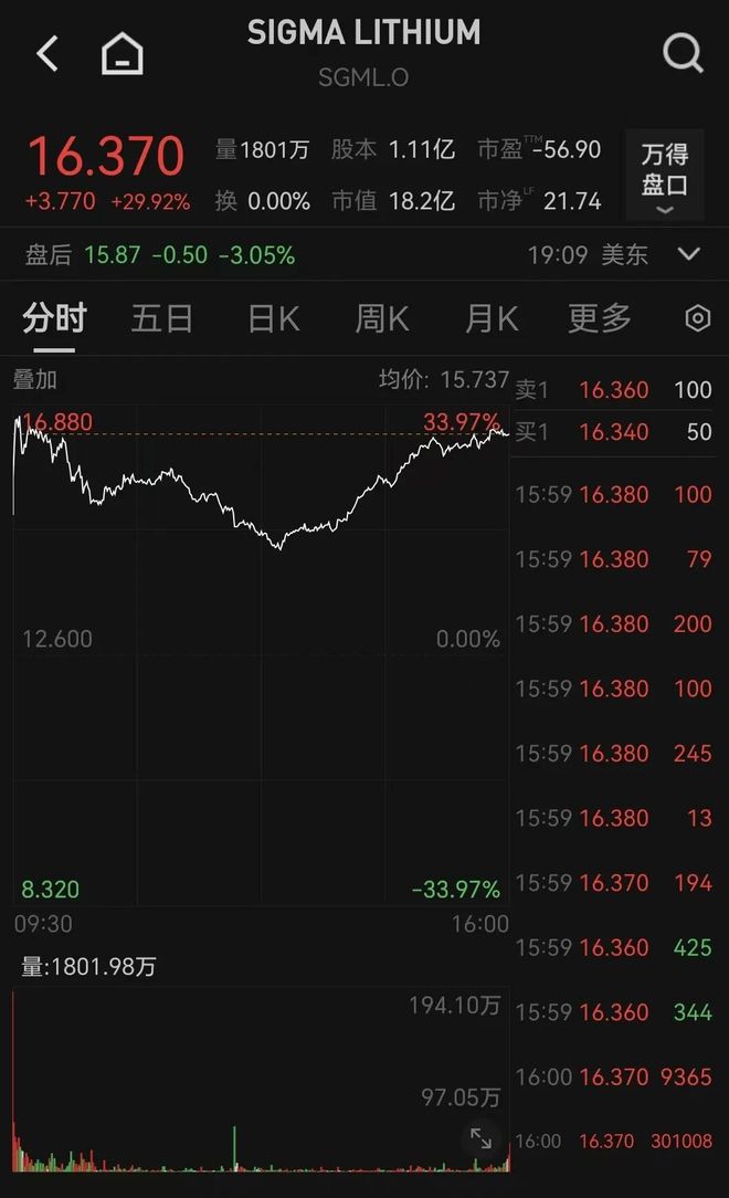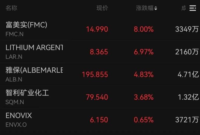 受该消息刺激,锂矿股上涨,全球领先的锂生产商SigmaLithium涨近30%,富美实涨8%,雅保涨4.83%,智利矿业化工涨3.68%。