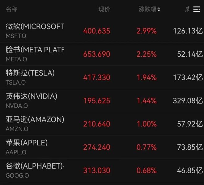 美股科技“七巨头”集体上涨,其中,微软涨近3%,脸书涨2.25%,特斯拉涨1.94%,英伟达涨1.44%,亚马逊涨1%。