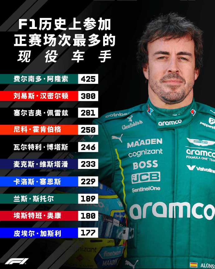 近日,F1官方更新社媒,晒出现役车手正赛出场榜。阿隆索以425场排名第一,同时也是F1历史上出场次数最多的车手。