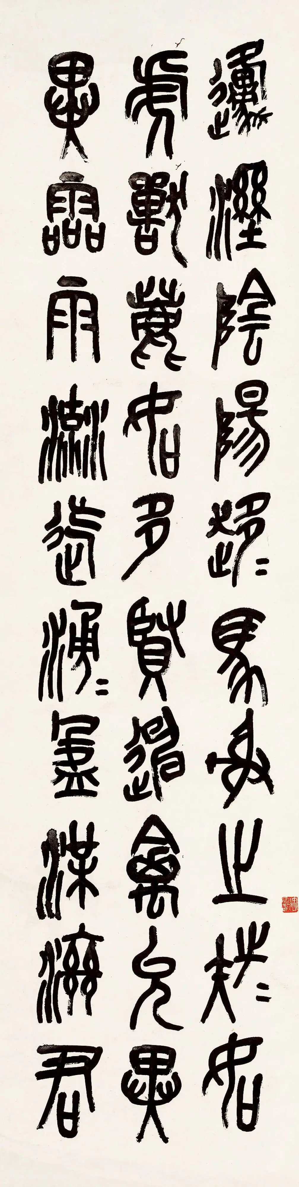 吴昌硕 节临石鼓文《銮车篇》,水墨纸本 136×34 cm.×4。吴昌硕书法着力于石鼓文,参以草法,故作篆书凝练遒劲,朴茂自然,气度恢宏,自出新意。这就是中国风遇见艺术