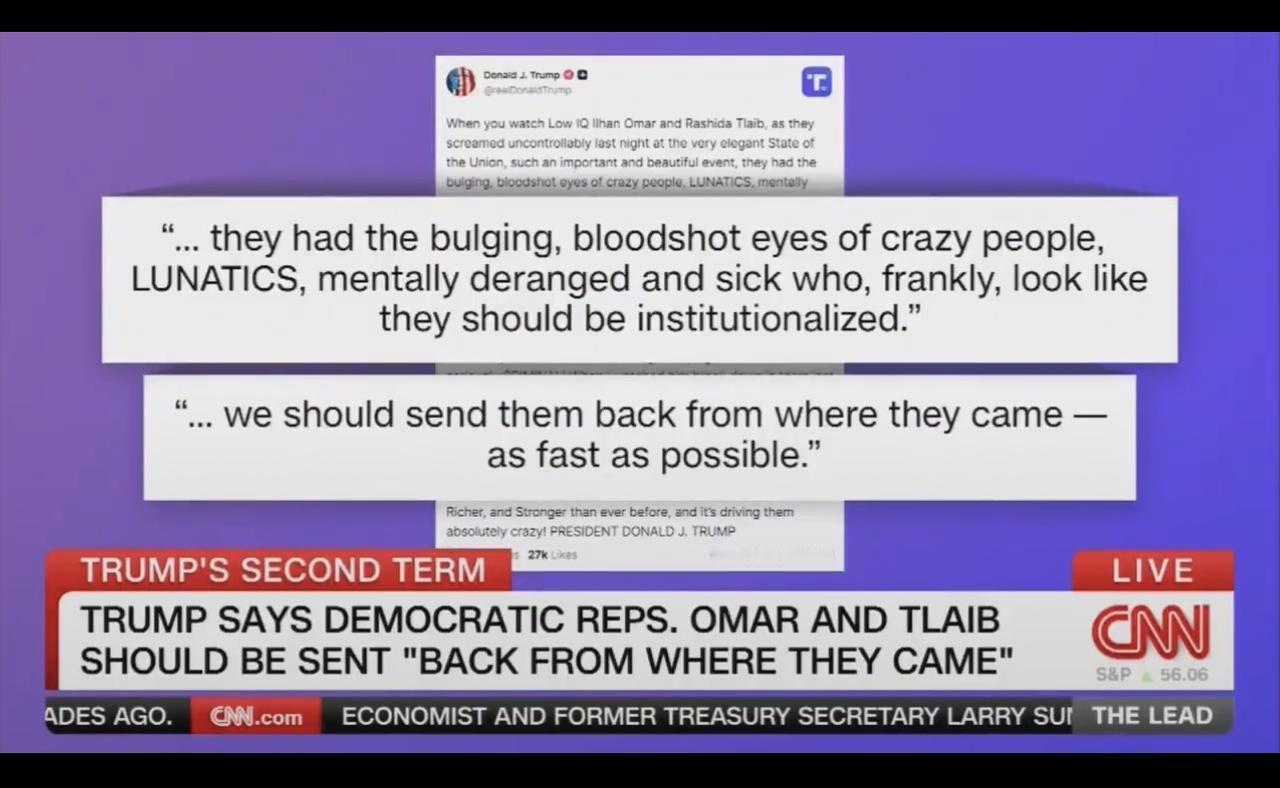问东答西 主持人塔珀Tapper:特朗普告诉有色人种,他们作为美国公民应该回到他们来的地方,你不觉得这有点种族歧视吗? 约翰逊参议员:听到有人扰乱总统讲话,真是太没礼貌了。