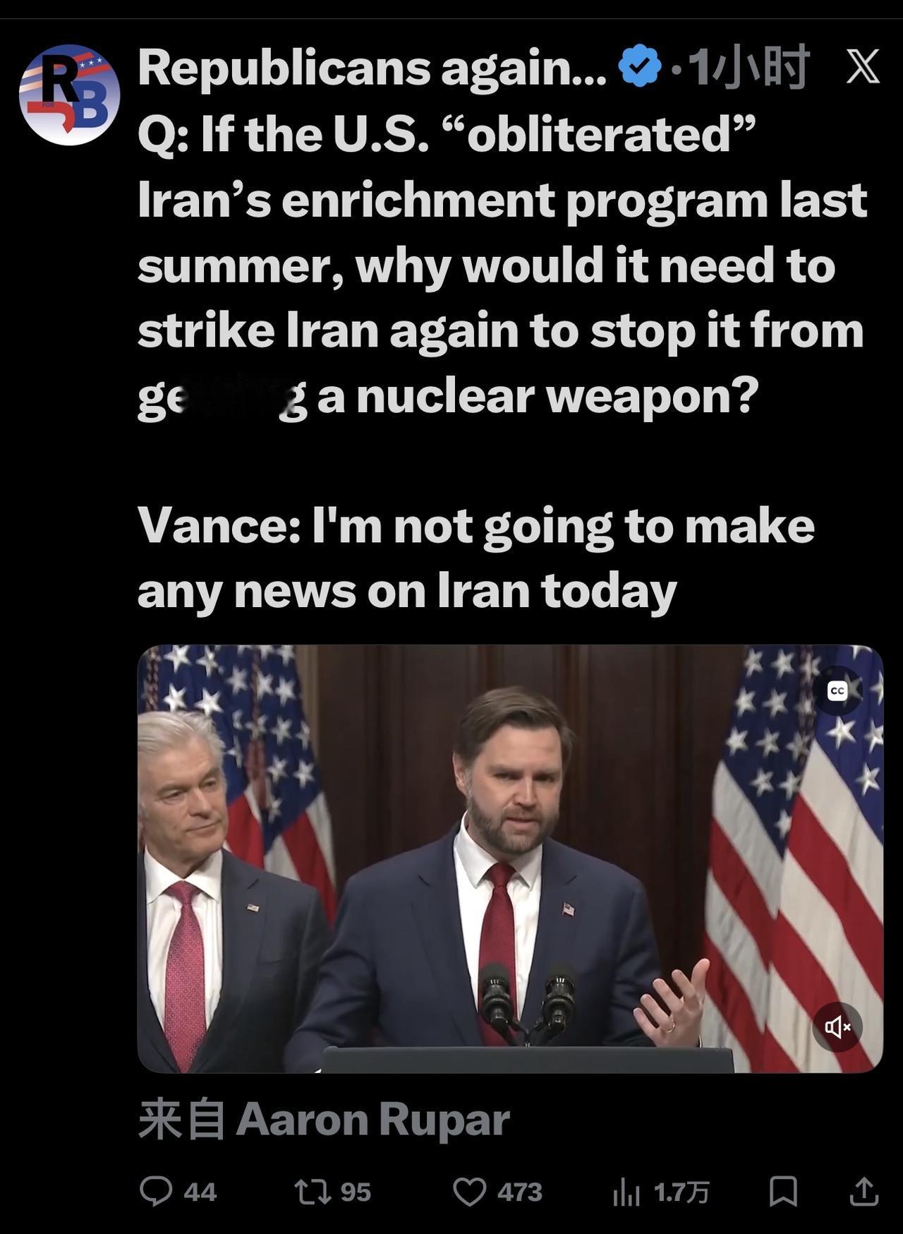 记者问:“如果美国去年夏天“摧毁”了伊朗的浓缩铀计划,为什么还需要再次打击伊朗以阻止其获得核武器?” 万斯:“我今天不会发布任何关于伊朗的新闻。” 去年6月21日,美国出动包括B-2隐形轰炸机在内125架飞机对伊朗核设施投放6枚掩体炸弹,事后,川普声称已摧毁伊朗核设施。
