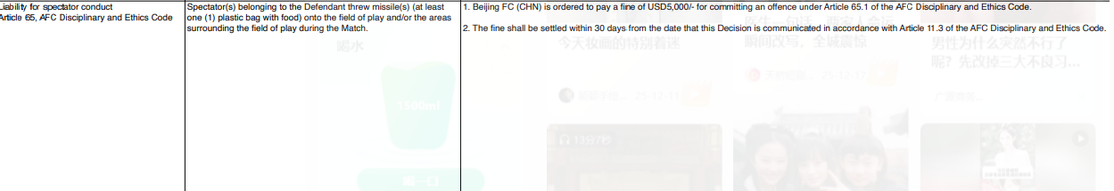 公告指出:该场比赛期间,球迷向场内扔杂物(至少是一包食物),依据亚足联纪律和道德准则65.1条款规定,对国安处罚5000美金,需从即日起限期30天内缴清。