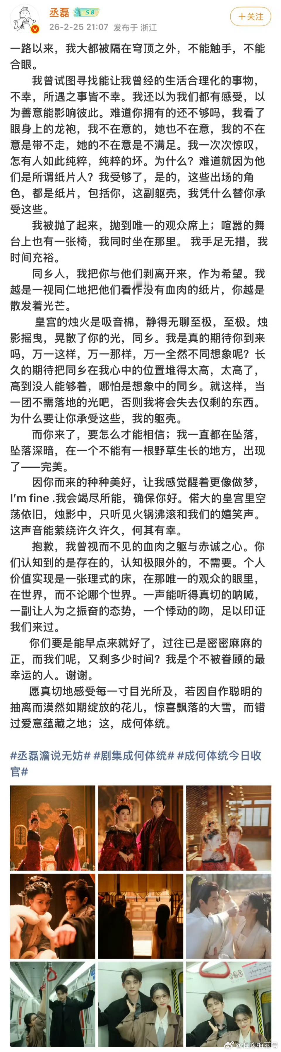 丞磊的117天32集800字剧集成何体统 丞磊写那800字的时候,笔尖大概停了无数次。因为每一次落笔,都是在和117天里的某个瞬间说再见。那些深夜对戏的记忆,那些片场等待的时光,那些角色附体的恍惚,都要在这一笔一划里清空。