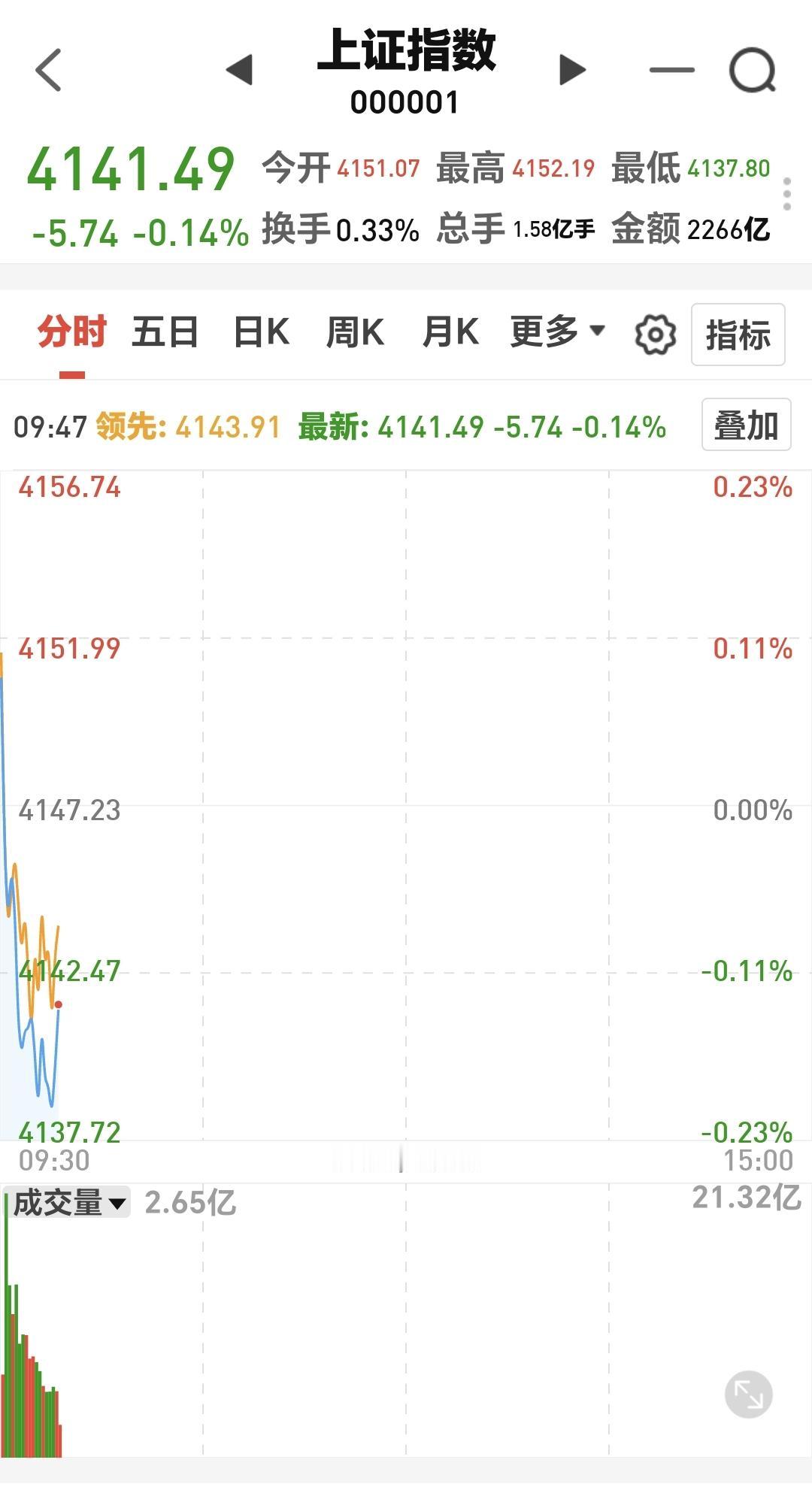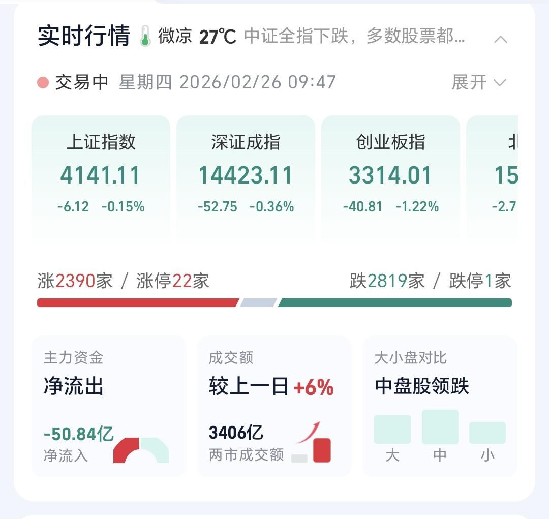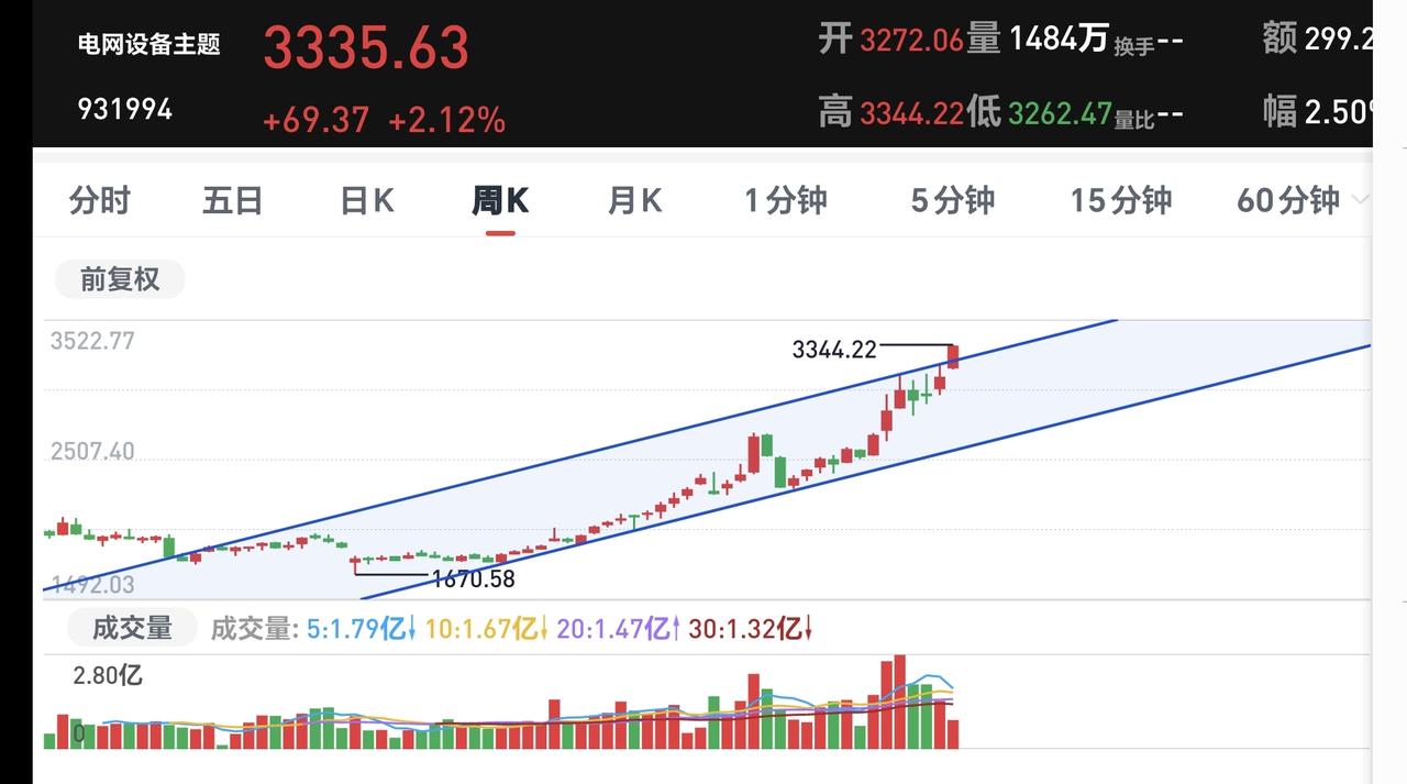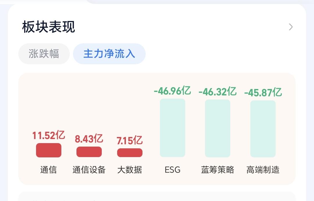 基金:这是开盘以后震荡的原因 今天市场开盘涨跌不一,创业板指开盘下跌了0.24%,开于3346点,上证指数上涨了0.09%,开于4151点。 开盘以后指数震荡向下,但黄色线在蓝色线的上方,今天大幅度下跌的可能性不大,探底回升的概率很大。 两市累计成交3406亿,相比于昨天同期放量了6%,这样的放量还是可以的,这也表明了今天大跌的可能性不大,市场上涨2300多家,下跌2800多家,下跌家数超过了上涨家数,涨停22家,跌停1家,主力资金净流出50亿。 整个市场主力资金净流入最多的三个板块是:通信板块,通信设备板块,大数据板块,主力资金净流出最多的三个板块是:ESg板块,蓝筹策略板块,高端制造板块。 看下面的截图7,这是富时A50的走势,我们9点半开盘,以后这个指数大幅度跳水,从上涨转为下跌,这也是我们今天开盘以后走低的主要原因。 持有基金现在盘中估值亏损了5348元,盈利金额最大的三个板块是:5G板块,白酒板块,证券板块,亏损金额最大的三个板块是:创新药板块,创业板指芯片,半导体板块。 整个市场上涨幅度最大的三个板块是:电网设备板块,通信板块,绿色电力板块,盘中下跌幅度最大的三个板块是:储能板块,半导体材料设备板块,固态电池板块。 电网设备板块日线级别处于上涨通道中,现在的位置距离上涨通道的上轨线更近一些,短线持有的人可以继续持有,不建议追涨进场。 电网设备板块周线级别也处于上涨趋势中,但已经上涨突破了上涨通道的上轨线,处于加速上涨过程中。这样的情况下,持有的人可以继续持有,想进场的人不建议进场。 凡是上涨突破上涨通道,上轨线的板块,都是已经进入了加速上涨的状态,凡是已经进入加速上涨状态的板块,都不建议追涨进场,但持有的人都是可以继续持有的,上涨通道的下轨线是持有条件,如果偏离上涨通道上轨线的距离过大,也是可以考虑部分止盈的,要不要止盈,这跟每个人的持有心态有关系,这跟每个人的持有理念有关系,每个人都有自己的策略,符合自己的策略才是最好的策略。 今天会不会再一次止盈,现在还不确定,还需要继续观察,有观点以后会第一时间分享。 花1秒钟点赞,花30秒钟评论,就是对我最大的支持,谢谢大家的支持。
