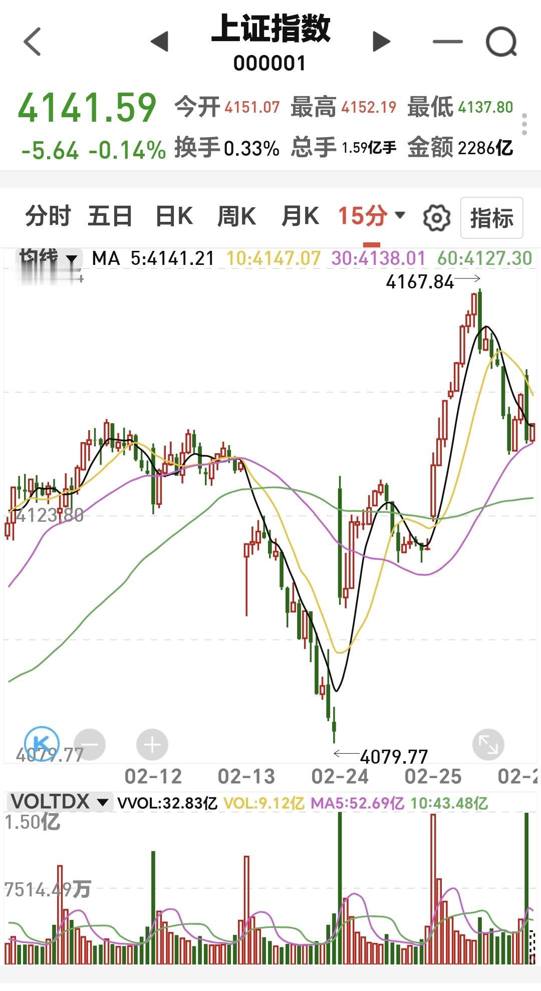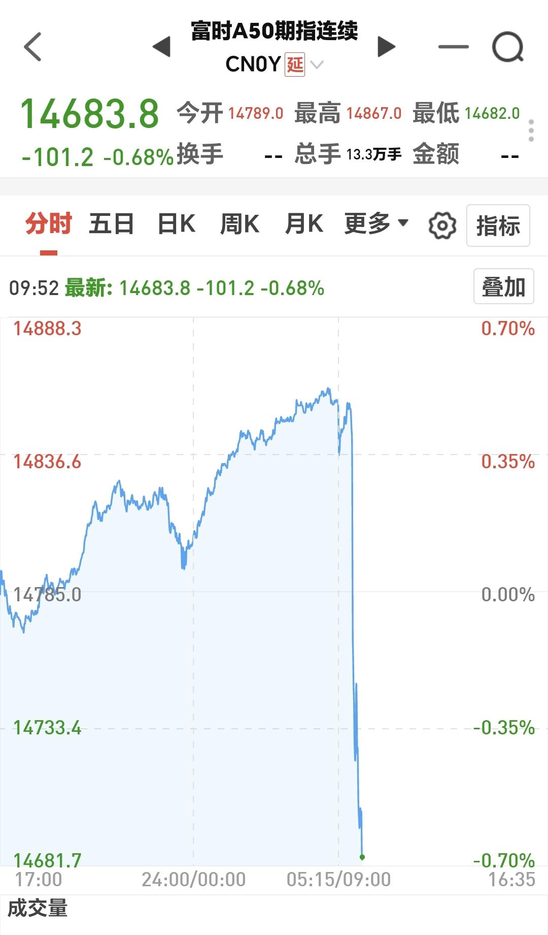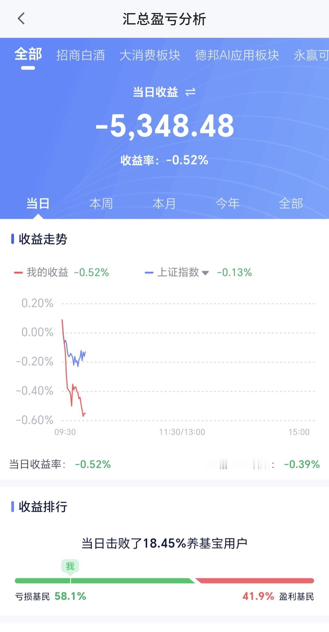基金:这是开盘以后震荡的原因 今天市场开盘涨跌不一,创业板指开盘下跌了0.24%,开于3346点,上证指数上涨了0.09%,开于4151点。 开盘以后指数震荡向下,但黄色线在蓝色线的上方,今天大幅度下跌的可能性不大,探底回升的概率很大。 两市累计成交3406亿,相比于昨天同期放量了6%,这样的放量还是可以的,这也表明了今天大跌的可能性不大,市场上涨2300多家,下跌2800多家,下跌家数超过了上涨家数,涨停22家,跌停1家,主力资金净流出50亿。 整个市场主力资金净流入最多的三个板块是:通信板块,通信设备板块,大数据板块,主力资金净流出最多的三个板块是:ESg板块,蓝筹策略板块,高端制造板块。 看下面的截图7,这是富时A50的走势,我们9点半开盘,以后这个指数大幅度跳水,从上涨转为下跌,这也是我们今天开盘以后走低的主要原因。 持有基金现在盘中估值亏损了5348元,盈利金额最大的三个板块是:5G板块,白酒板块,证券板块,亏损金额最大的三个板块是:创新药板块,创业板指芯片,半导体板块。 整个市场上涨幅度最大的三个板块是:电网设备板块,通信板块,绿色电力板块,盘中下跌幅度最大的三个板块是:储能板块,半导体材料设备板块,固态电池板块。 电网设备板块日线级别处于上涨通道中,现在的位置距离上涨通道的上轨线更近一些,短线持有的人可以继续持有,不建议追涨进场。 电网设备板块周线级别也处于上涨趋势中,但已经上涨突破了上涨通道的上轨线,处于加速上涨过程中。这样的情况下,持有的人可以继续持有,想进场的人不建议进场。 凡是上涨突破上涨通道,上轨线的板块,都是已经进入了加速上涨的状态,凡是已经进入加速上涨状态的板块,都不建议追涨进场,但持有的人都是可以继续持有的,上涨通道的下轨线是持有条件,如果偏离上涨通道上轨线的距离过大,也是可以考虑部分止盈的,要不要止盈,这跟每个人的持有心态有关系,这跟每个人的持有理念有关系,每个人都有自己的策略,符合自己的策略才是最好的策略。 今天会不会再一次止盈,现在还不确定,还需要继续观察,有观点以后会第一时间分享。 花1秒钟点赞,花30秒钟评论,就是对我最大的支持,谢谢大家的支持。