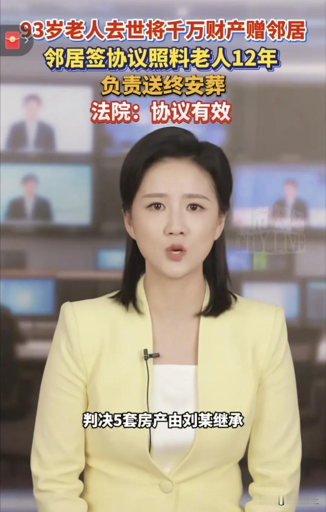 这是一个非常典型的“养儿防老不如邻居”的案例,结局虽然圆满,但过程往往最能照进人性。 照顾邻居12年得5套房,老人尸骨未寒,平时不见人的亲戚们坐不住了! 这是现实版的好人有好报,更是现实版见钱眼开! 北京顺义的阮大爷,终身未娶,无儿无女。2011年,村里的刘某看他孤苦伶仃,签了遗赠扶养协议,把他当亲爹照顾了整整12年,直到93岁高龄去世。后来赶上拆迁,老人名下分到了5套安置房和380多万补偿款,总价值过千万。 老人走了,刘某厚葬了他。这时候,平时十几年没露过面的亲戚们突然“醒”了。 他们虽然没有赡养过老人一天,甚至逢年过节都不见踪影,但在巨额财产面前,血缘的“亲情”瞬间被唤醒了。他们觉得,这钱和房子,怎么也不能全给一个“外人”。 可法律不是摆设,证据更不会撒谎。法院走访调查,村委会和邻居都作证:这12年,是刘某端屎端尿伺候的,是刘某陪着看病拿药的,也是刘某给老人送的终。最终,法院判决:5套房,归刘某。 说实话,看到这儿,心里挺不是滋味的。 平时不见人,分钱一家人。这就是人性最现实的一面。有些所谓的亲戚,就像是在黑暗里潜伏的猎人,平时闻不到味道,但只要嗅到金钱的血腥气,立刻就会从四面八方冒出来,试图抢走那块本不属于他们的“肉”。 好在法律是清醒的。它告诉我们:生前的陪伴,永远比死后的哭丧值钱;端了12年的饭碗,远比那一纸血缘证明更重。 奉劝那些只在遗产面前才记起“亲情”的人:别抢了,你们抢的不是房子,是人家拿真心和汗水换来的回报。