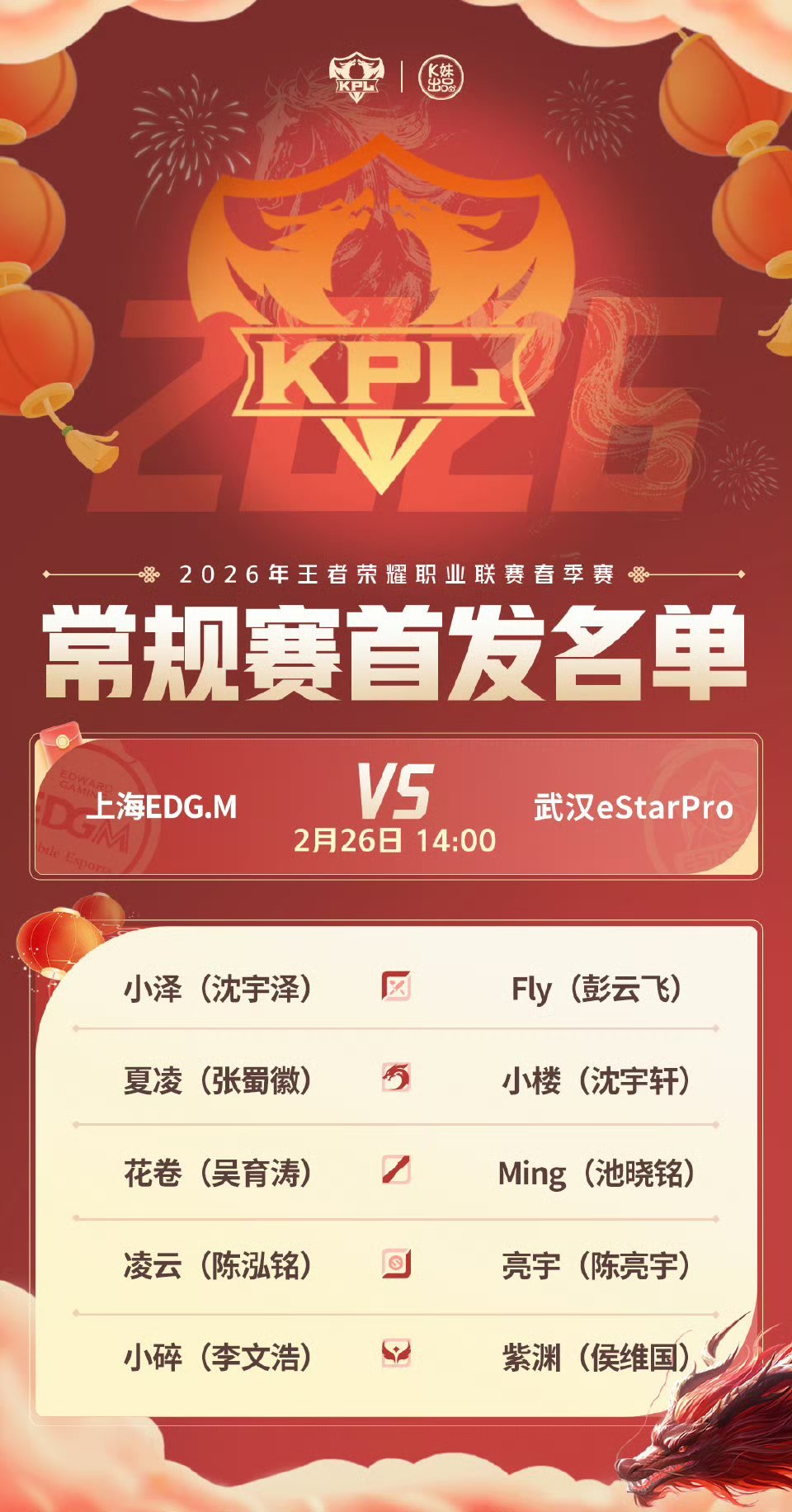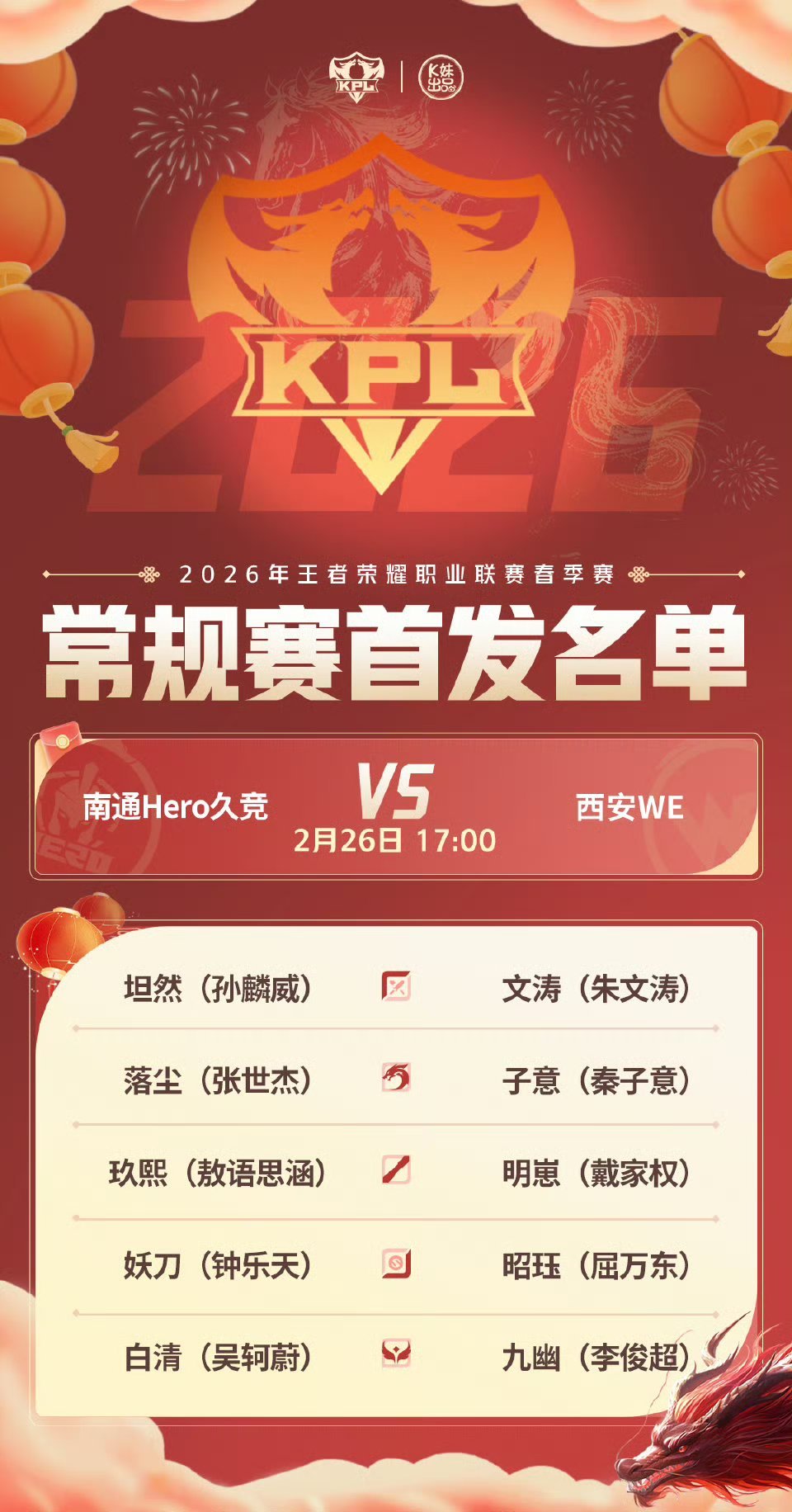 2026KPL春季赛今日首发名单 无言重回首发