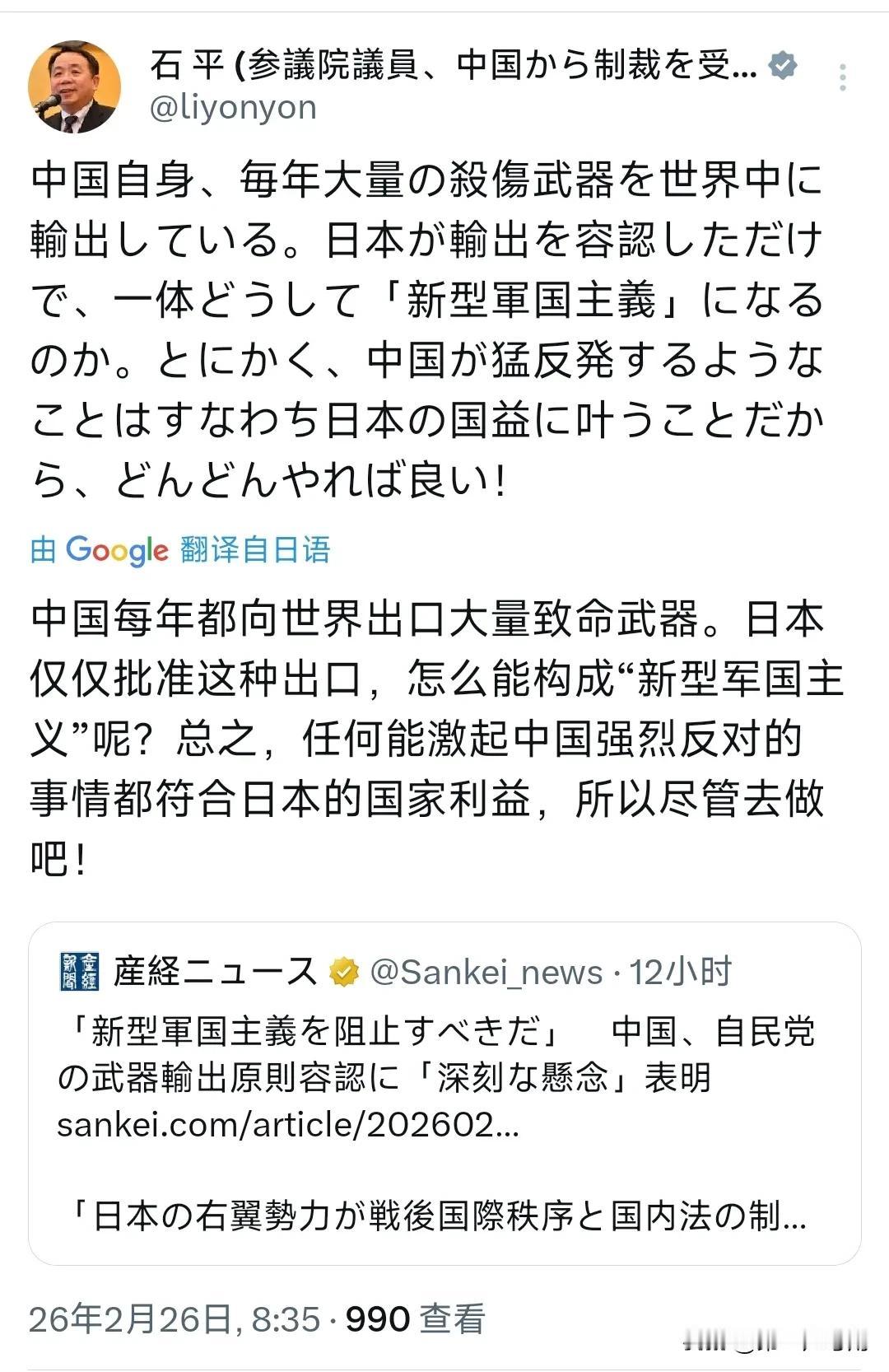 日本参议员、汉奸石平今天(2月26日)写道:“中国每年都向世界出口大量致命武器。日本仅仅批准这种出口,怎么能构成‘新型军国主义’呢?总之,任何能激起中国强烈反对的事情都符合日本的国家利益,所以尽管去做吧!” 评几句 石平此论,堪称混淆视听的诡辩范本与政治投机的露骨告白的混合体。 其逻辑之荒谬,在于刻意回避了性质的根本差异。 中国作为联合国安理会常任理事国,其军贸活动严格遵守国际法与联合国决议,出口对象、用途均受国际监督;而日本此次突破"武器出口三原则",实质是架空和平宪法、挣脱战后国际秩序束缚的关键一步。前者是主权国家的正常军贸权利,后者是战争责任国对和平承诺的系统性背弃。将二者简单等同,如同将持证行医与非法贩药混为一谈,非蠢即坏。 其立场之卑劣,在于将"反华"凌驾于日本国家利益之上。 "任何能激起中国强烈反对的事情都符合日本国家利益"——此语彻底暴露了其作为政治投机者的本质。真正的国家利益建立在地区稳定、经济繁荣与战略自主之上,而非建立在刻意制造对抗、充当域外大国马前卒的冒险主义之上。石平所鼓吹的,实质是让日本为个别政客的反华执念买单,将国家命运绑在对抗的战车上。 这种言论折射出历史修正主义的危险苗头。 当日本社会讨论"正常国家化"时,石平之流刻意将中国的合理关切歪曲为"干涉",将国际社会的警惕污名化为"打压",其目的无非是为突破专守防卫、复活军事大国地位制造舆论烟幕。这种以"受害者"姿态行"加害者"之实的话术,与军国主义时期"自卫战争"的叙事逻辑一脉相承。 产经新闻所报道的中国"严重关切",并非针对日本的主权权利,而是针对日本是否正在背离和平发展道路的战略疑问。石平急不可耐地跳出来煽动对立,恰恰证明了这种关切的必要性——当"新型军国主义"的辩护者开始叫嚣"尽管去做"时,世人更需警惕:和平,从来不是理所当然的。